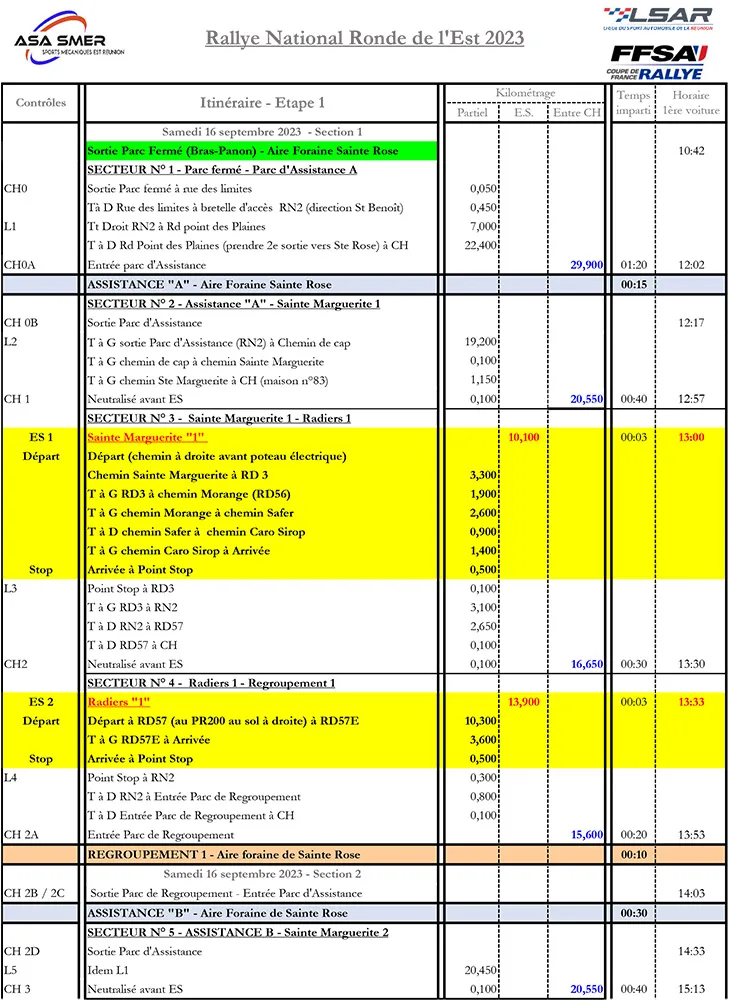 Deux spéciales seront à parcourir en 3 fois: RADIERS (Sainte Rose) et SAINTE MARGUERITE (Saint Benoît). A l’issue de ces 6 spéciales, les concurrents rejoindront le Parc Fermé, donc, toujours situé au Champ de Foire de Bras Panon.