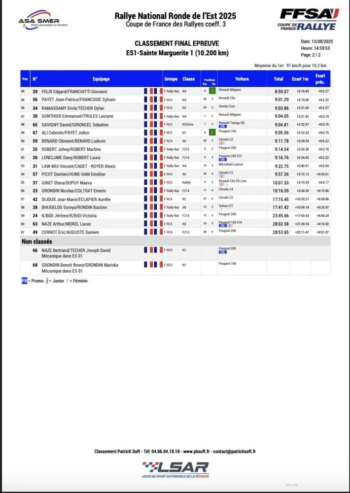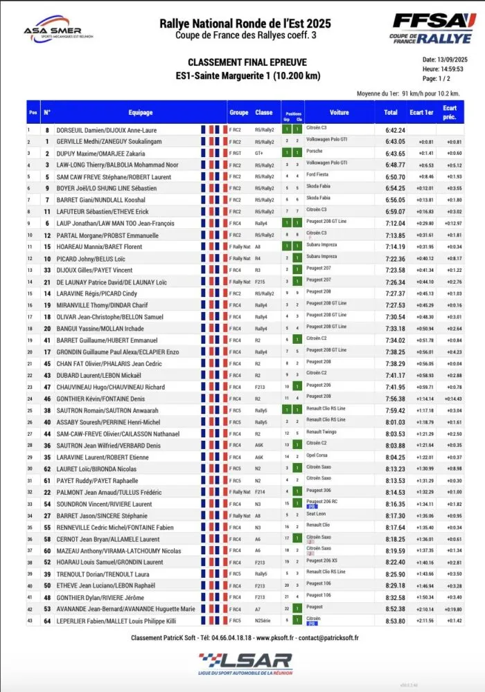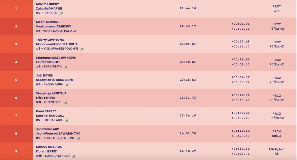 Thierry Law-Long a remporté cette édition grâce à une performance solide et constante, profitant également d’une mésaventure pour son principal rival, Meddy Gerville. Ce dernier a été contraint à l’abandon après une sortie de route, bouleversant ainsi la hiérarchie du championnat. Grâce à ce retrait, Law-Long reprend la tête du classement général alors que la saison entre désormais dans sa phase finale.