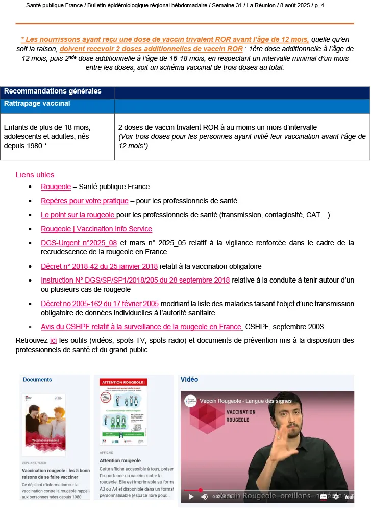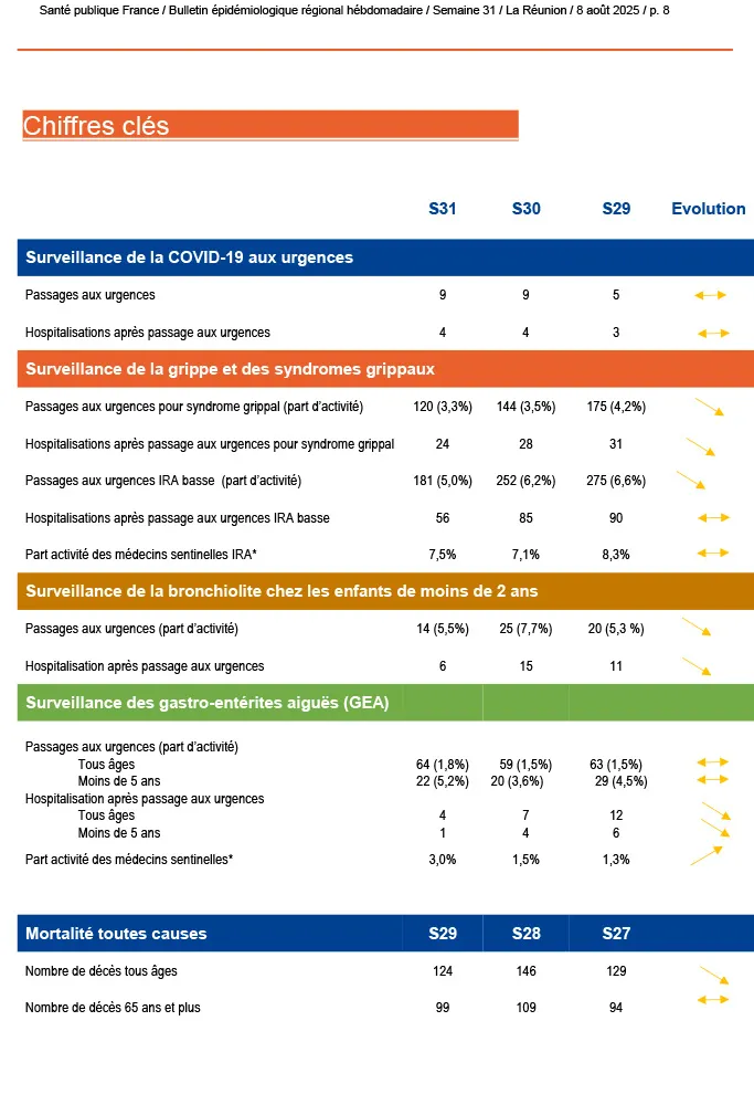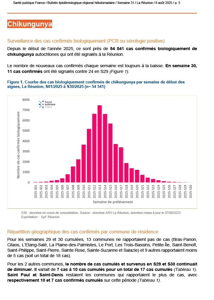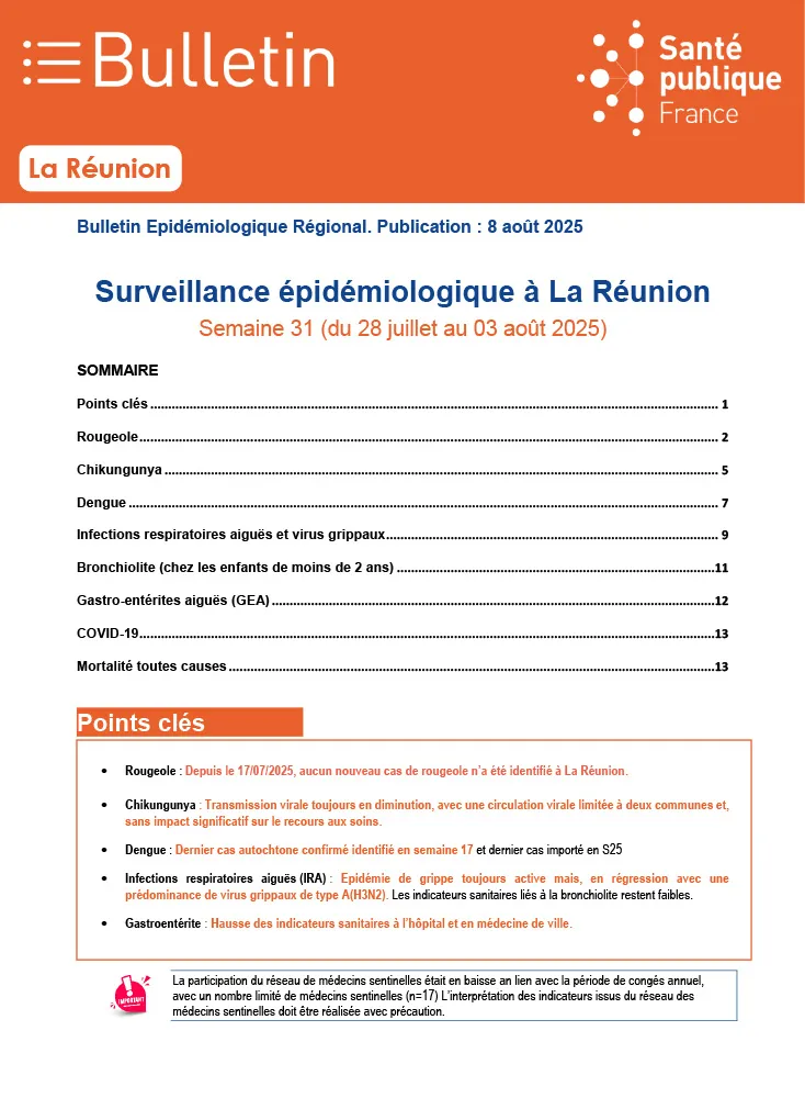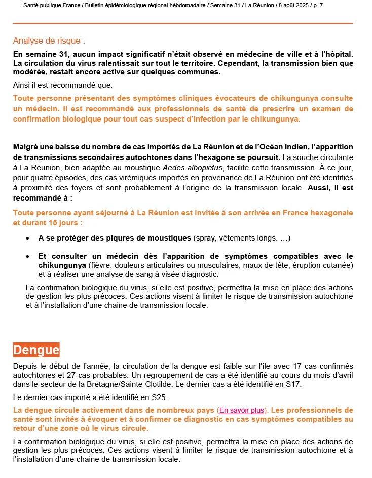 Depuis le 17 juillet 2025, aucun nouveau cas de rougeole n’a été signalé sur l’île. La transmission du chikungunya poursuit sa baisse, ne concernant plus que deux communes et sans impact notable sur la fréquentation des soins. Concernant la dengue, aucun cas autochtone n’a été détecté depuis la semaine 17 et le dernier cas importé remonte à la semaine 25.