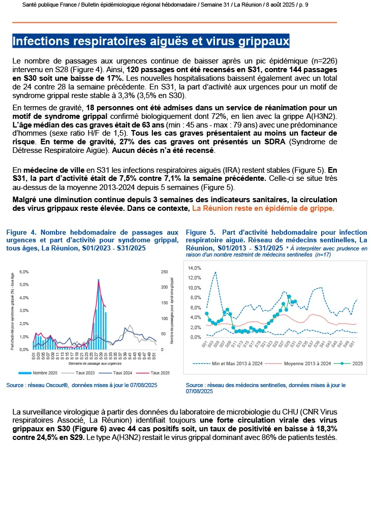 En matière d’infections respiratoires aiguës, l’épidémie de grippe reste active mais en recul, avec une prédominance du virus A(H3N2). Les indicateurs de bronchiolite demeurent faibles. En revanche, la gastro-entérite connaît une hausse des cas, observée aussi bien à l’hôpital qu’en médecine de ville.