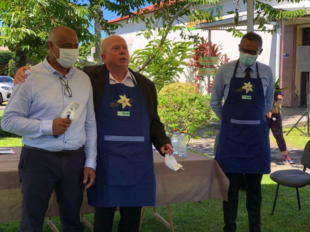 De gauche à droite : Johnny Payet, Michel Vergoz et Jeannick Atchapa, avec leur tablier, car juste avant ils avaient participé à un atelier cuisine avec un grand chef sur le thème de la vanille.