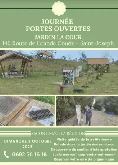 ● Jardin La Cour – Journée portes ouvertes – Visite guidée de la petite ferme – Balades dans le jardin des nombres – Découverte du sentier d’interprétation – Ecole marron : apprendre autrement – Réservez votre pique-nique. 0692 56 16 16.