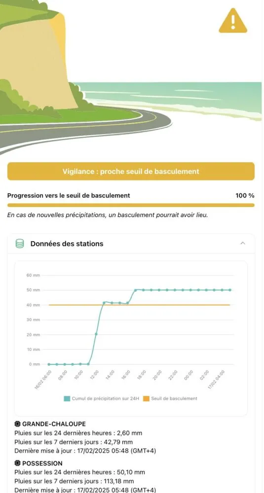 Actualités Route du Littoral : réouverture effective par La rédaction F R 17 février 2025 1 min de lecture La RN1 Route du Littoral est rouverte sur 4 voies entre La Grande Chaloupe et La Possession. La circulation se fait toutefois sur voies réduites côté mer. La remise à zéro de la chaine de blocs est en cours. Source : CRGT & route.re Ne manquez pas toute l’actualité de La Réunion ! Abonnez-vous à la newsletter de Free Dom ! Valider Partager Facebook Twitter Pinterest Linkedin Whatsapp Reddit Email Vous pourriez être intéressé par 1 janvier 2026 Jeudi 1ᵉʳ janvier 2026 – Météo, éphéméride et horoscope du jour 31 décembre 2025 Mercredi 31 décembre 2025 – Météo, éphéméride et horoscope du jour 30 décembre 2025 Mardi 30 décembre 2025 – Météo, éphéméride et horoscope du jour La rédaction F R Laisser un commentaire Annuler la réponseYour email address will not be published. Enregistrer mon nom, mon e-mail et mon site dans le navigateur pour mon prochain commentaire. Current ye@r * Leave this field empty Article précédent Bilan du week-end des contrôles de la gendarmerie : 95 infractions, 16 permis retirés, 12 véhicules saisis, 17 cas d’alcoolémie Article suivant Kossa i manze à la cantine cette semaine du 17 au 21 février Articles récents... Jeudi 1ᵉʳ janvier 2026 – Météo, éphéméride et horoscope du jour Mercredi 31 décembre 2025 – Météo, éphéméride et horoscope du jour Hommage à Johnny Hallyday sur Free Dom 2 ce 5 décembre Mardi 30 décembre 2025 – Météo, éphéméride et horoscope du jour Saint-Joseph : découverte de 2337 plants de cannabis, arrestation de 2 individus Point sur le réseau routier départemental, 29 décembre à 16H30 Suicide sur le pont de la Rivière d’Abord : importante mobilisation des secours et des forces de l’ordre Radier submergé à Ilet Furcy : la route de Cilaos fermée à la circulation cette nuit Fortes pluies : appel à la plus grande prudence à Saint-Paul Saint-Gilles-les-Bains : une route impraticable, les riverains montent au créneau (VIDEOS)