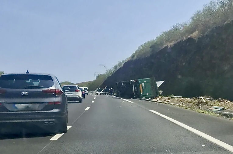 Un camion s’est renversé sur le flanc, entre la station-service et Corail Hélicoptères, sur la route des Tamarins. Vos infos 02.62.41.51.51