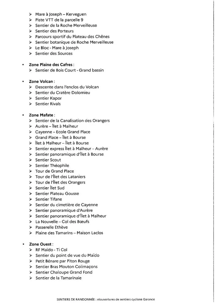 Suite aux travaux et/ou évaluations d’état de certains sentiers de randonnée pédestre situés sur le domaine forestier géré par l’ONF de La Réunion à la suite du passage du cyclone Garance, certains sentiers peuvent être réouverts. Parmi la cinquantaine de sentiers, figurent notamment le sentier Col des Bœufs – La Nouvelle, la Canalisation des Orangers, le sentier Scout, de nombreux sentiers inter-Îlet et intra-Îlet de Mafate, Bois Court – Grand Bassin, les sentiers de l’enclos du Volcan, etc.