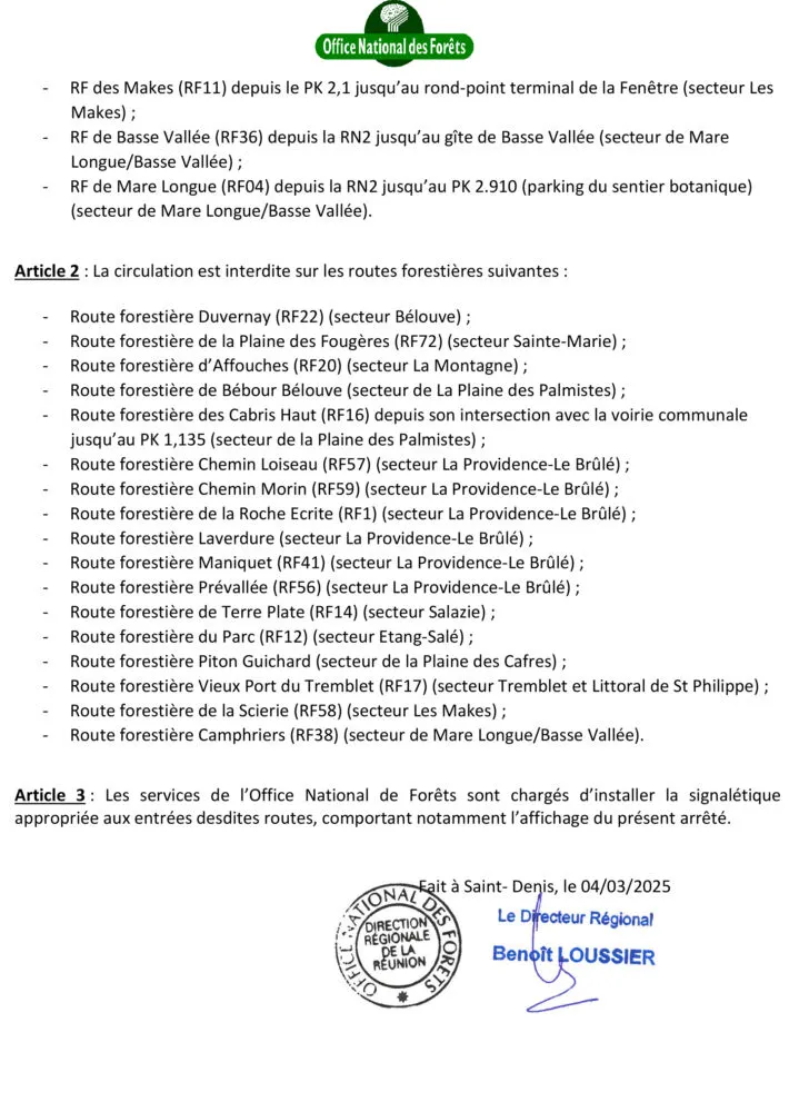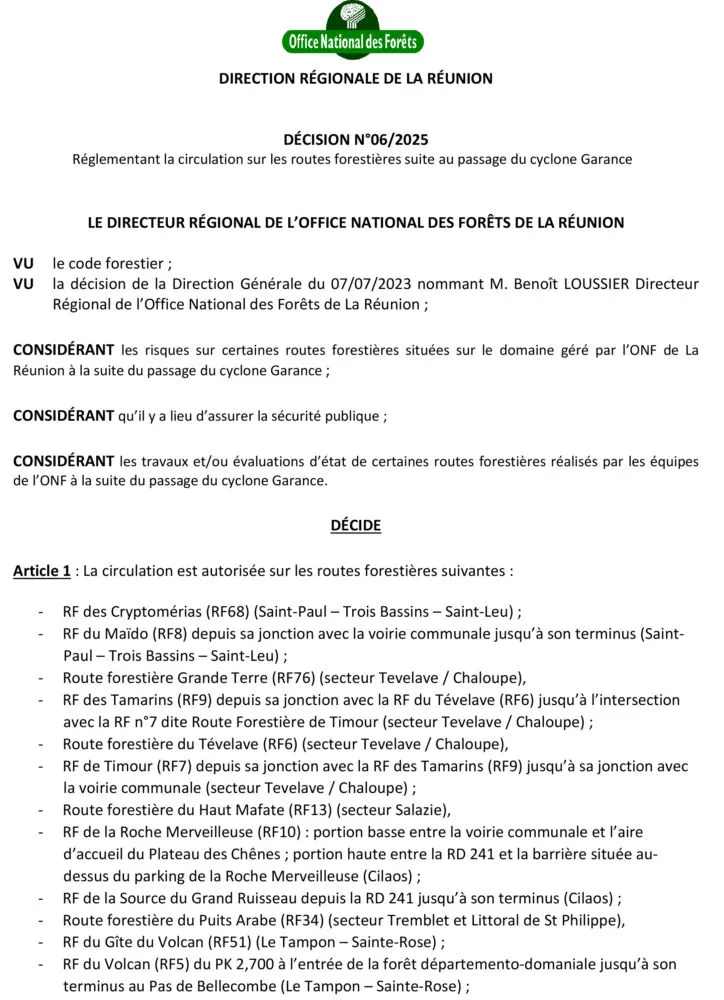 Suite aux travaux et/ou évaluations d’état de certaines routes forestières situées sur le domaine forestier géré par l’ONF de La Réunion à la suite du passage du cyclone Garance, certaines routes forestières peuvent être réouvertes.