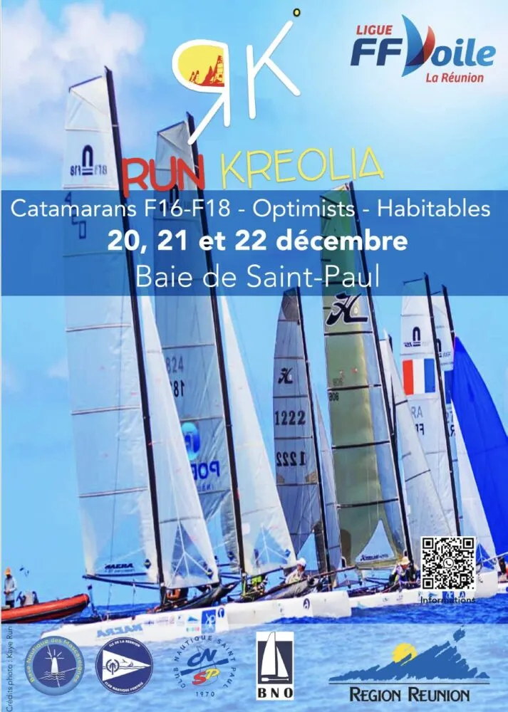 Ouvert aux catamarans à spi (Nacra 15, Nacra 500, F18 et inter-séries), ainsi qu’aux Optimist et aux Habitables, le Run Kréolia met en valeur la diversité des supports et des pratiques de la voile réunionnaise.