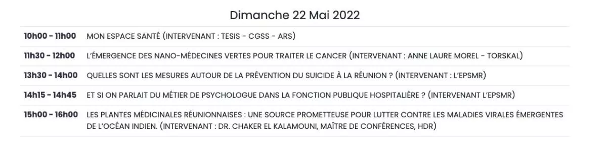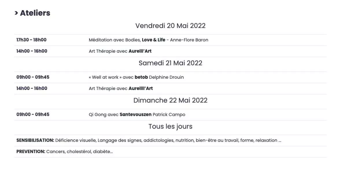 Ces différents espaces seront complétés par un programme riche en conférences afin de vous offrir toutes les informations utiles liées à votre santé et votre bien-être.