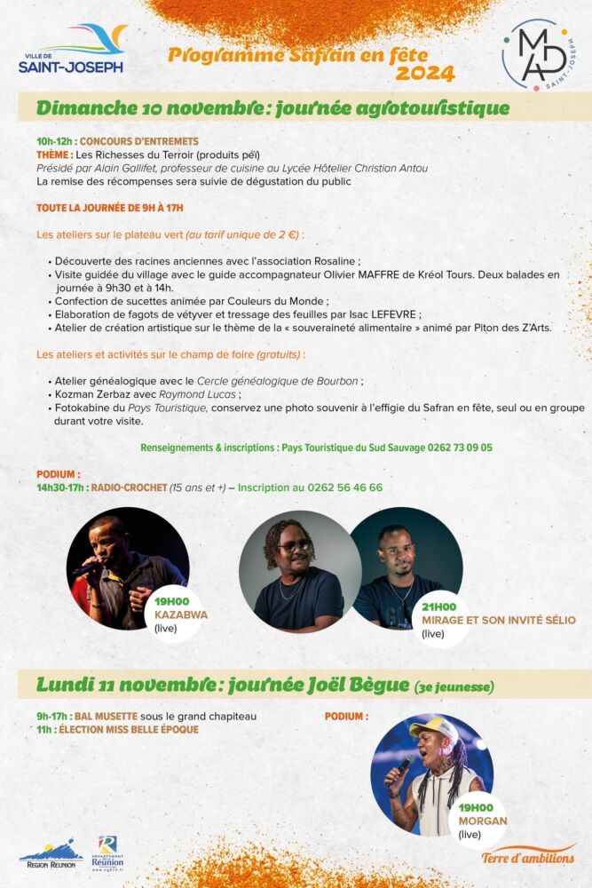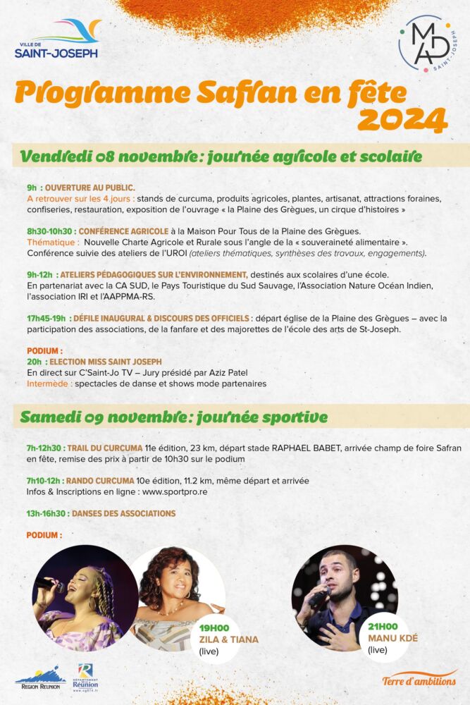 Le Safran en Fête est de retour à la Plaine des Grègues ! Pendant quatre jours, du 8 au 11 novembre, l’événement mettra à l’honneur le safran pays et la culture locale, en proposant une riche programmation qui saura enchanter petits et grands. Jean-Bernard Gonthier, directeur de la Maison des associations de Saint-Joseph, et Océane Boulevard, coach et coordinatrice des Miss Saint-Joseph, nous en disent plus sur cet événement incontournable.