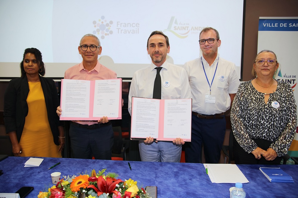 Ce jeudi 3 octobre 2024, la ville de Saint-André représentée par le Maire, Monsieur Joé BEDIER, et France Travail RÉUNION, représenté par Monsieur Pierrick OUVRARD, Directeur Territorial, ont signé une convention visant à faciliter l’insertion professionnelle des demandeurs d’emplois de la commune et à répondre aux besoins de recrutement des entreprises du territoire.