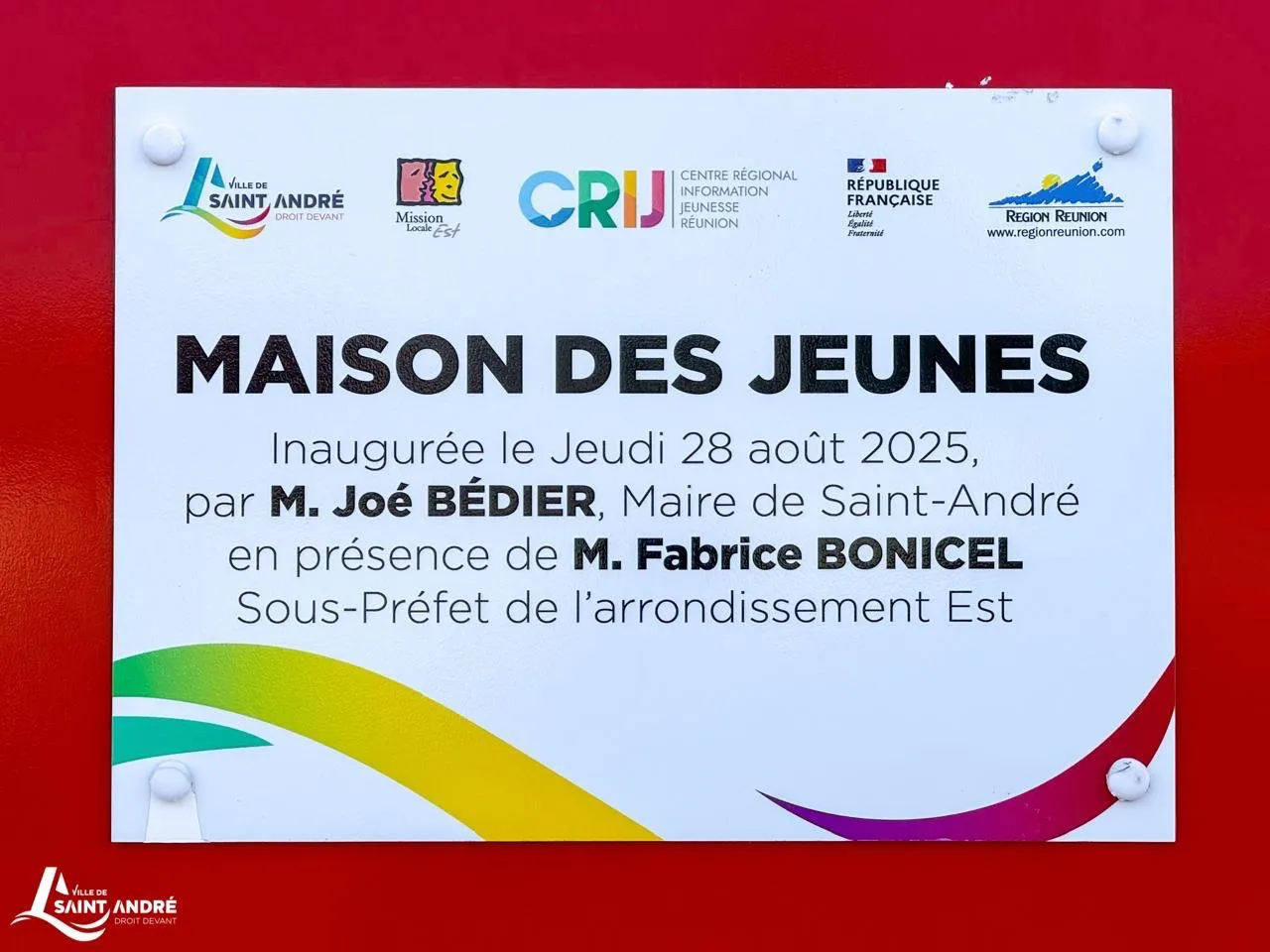 Ce jeudi 28 août 2025, la Ville de Saint-André a inauguré sa toute nouvelle Maison des Jeunes, en présence du Maire Joé BÉDIER, de son équipe municipale, du représentant de la DRAJES William OULÉDI, de la Directrice de la Mission Locale Est Magalie BUDEL, du représentant du CRIJ Louis LORIETTE, mais aussi des principaux des collèges de Fayard et de Mille Roches, ainsi que des ambassadeurs du lycée Mahatma Gandhi.
