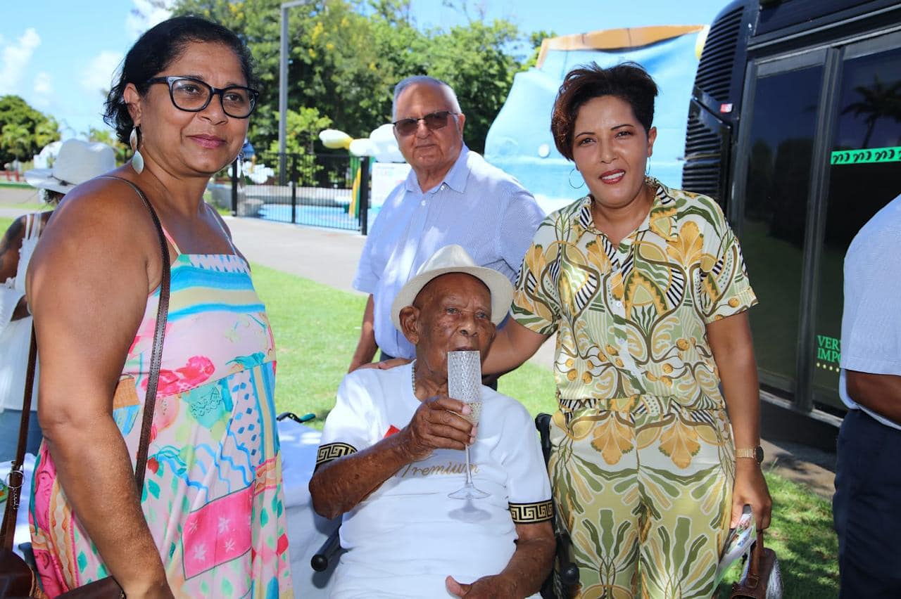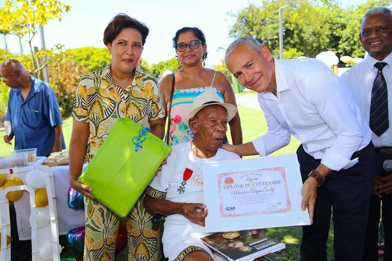 Pour célébrer cet anniversaire exceptionnel, la Société des Membres de la Légion d’Honneur a organisé une fête au Parc du Colosse. Accueilli en bus VIP, Sully Argand a reçu les honneurs du maire Joé Bédier et des élues Sabrina Benoit et Jimmye Coupou, qui lui ont remis diplôme et cadeaux.