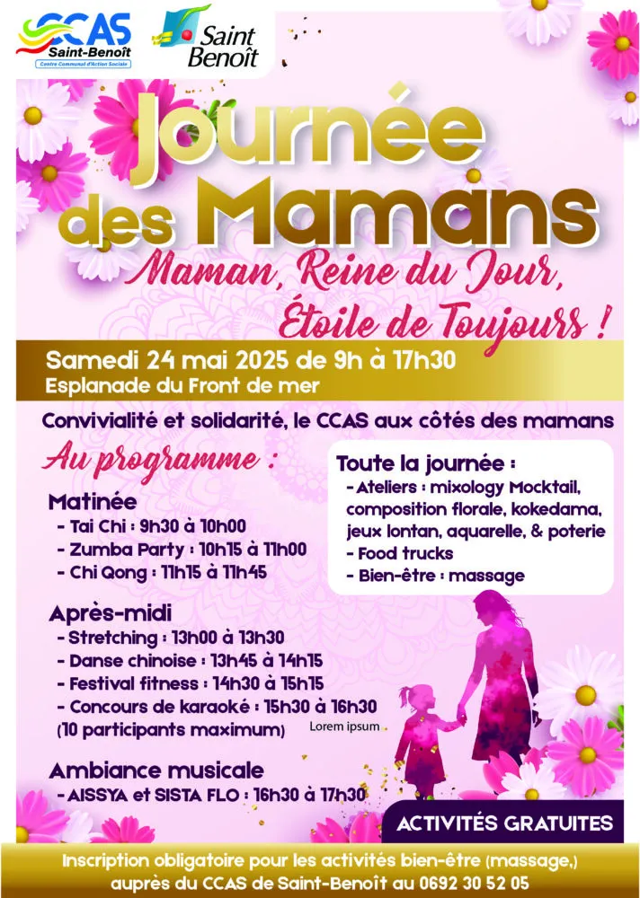À l’occasion de la fête des mères, le CCAS de Saint-Benoît, en collaboration avec la Ville, organise une journée dédiée aux mamans placée sous le signe du bien-être, de la convivialité et de la détente.