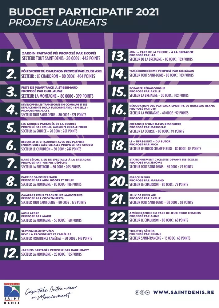 Du 6 au 15 décembre, les Dionysiens ont pu participer à la phase de vote citoyen en ligne pour sélectionner les projets qui émergeront à Saint-Denis en 2022. 289 projets d’aménagement ont été déposés par les habitants de Saint-Denis pour les différents quartiers de la ville au mois d’octobre 2021. Après la phase d’analyse du mois de novembre, les services de la Ville ont retenu 32 projets, pour un montant total de 2 045 000 €.