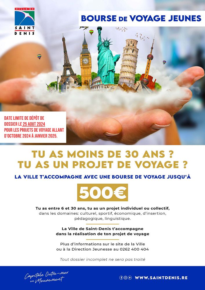 Pour plus d’informations et/ou pour obtenir le dossier de demande directement sur le site internet de la ville : https://www.saintdenis.re/boursedevoyage