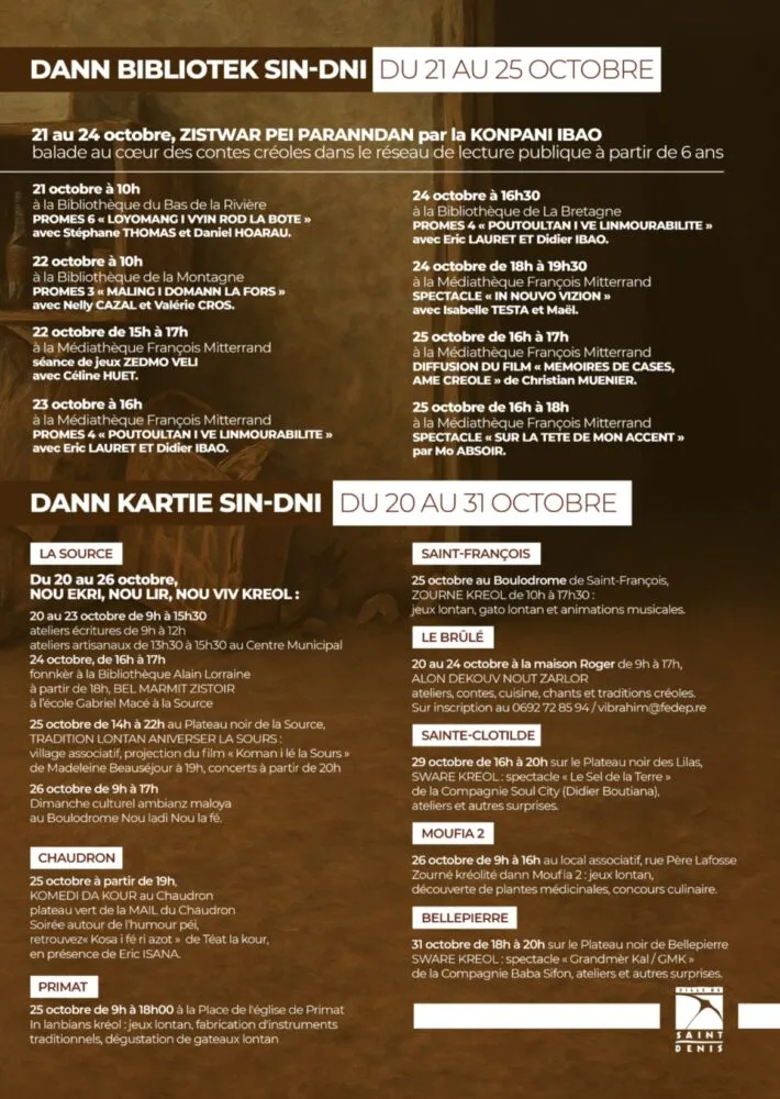 Spectacle « Zistwar péi paranndan » – Konpani IbaoPromes 6 : « Loyomang i vyin rod la bote » avec Stéphane Thomas et Daniel HoarauMardi 21 octobre – ⏰ 10hBibliothèque Bas de la RivièreBel Marmit Zistoir – Spécial Somèn KréolVendredi 24 octobre – ⏰ 18hÉcole Gabriel Macé (La Source)Komédi Da Kour – Spécial Somèn KréolSamedi 25 octobre – ⏰ 19hMail du ChaudronSpectacle « Sur la tête de mon accent » – Mo AbsorSamedi 25 octobre – ⏰ 16hMédiathèque François Mitterrand