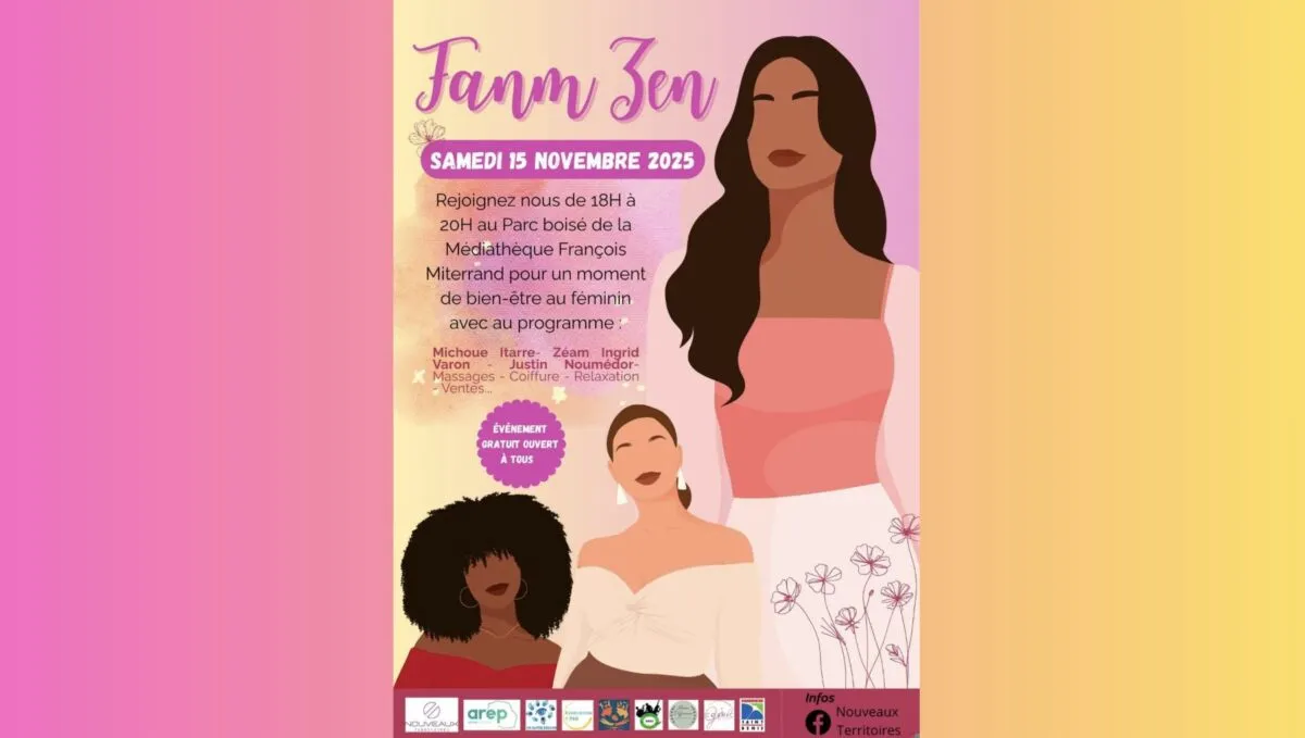 Ce samedi 15 novembre 2025, de 18h à 20h, le parc boisé de la médiathèque François-Mitterrand se transforme en véritable bulle de douceur pour accueillir Fanm Zen, un événement 100 % bien-être au féminin.