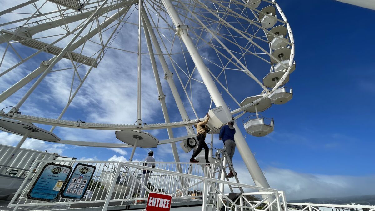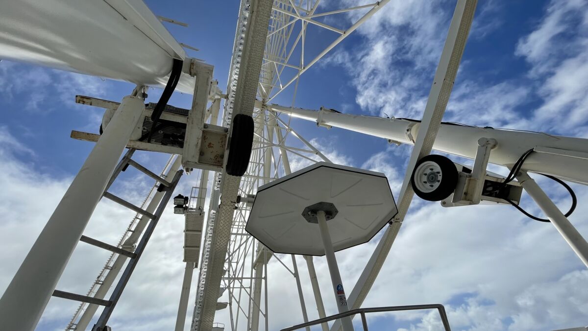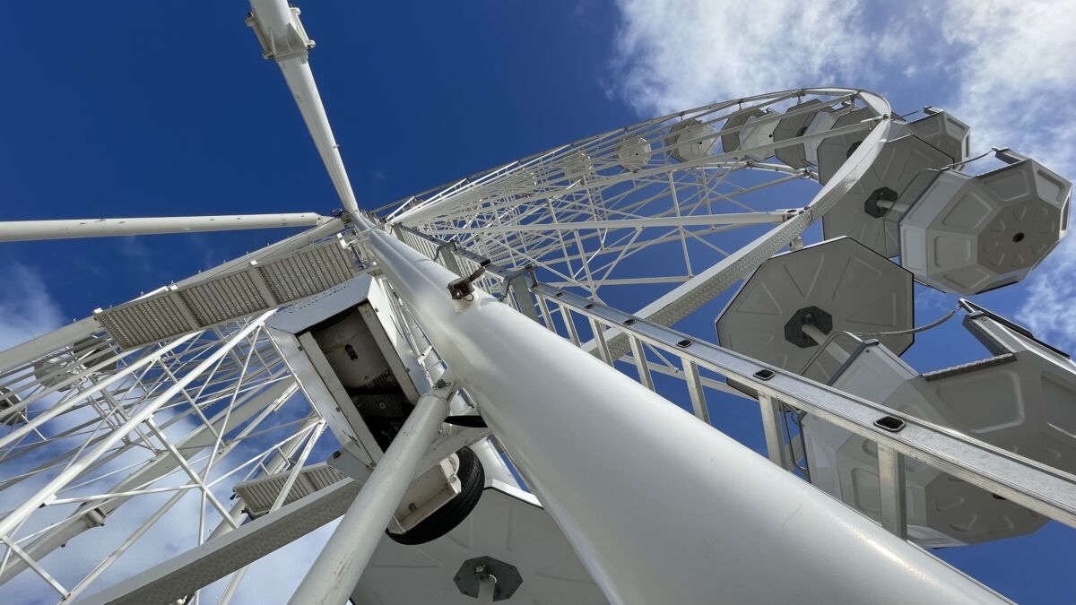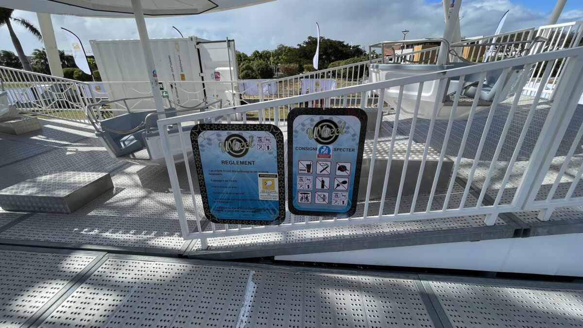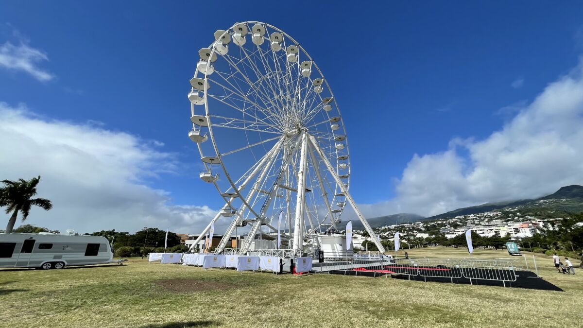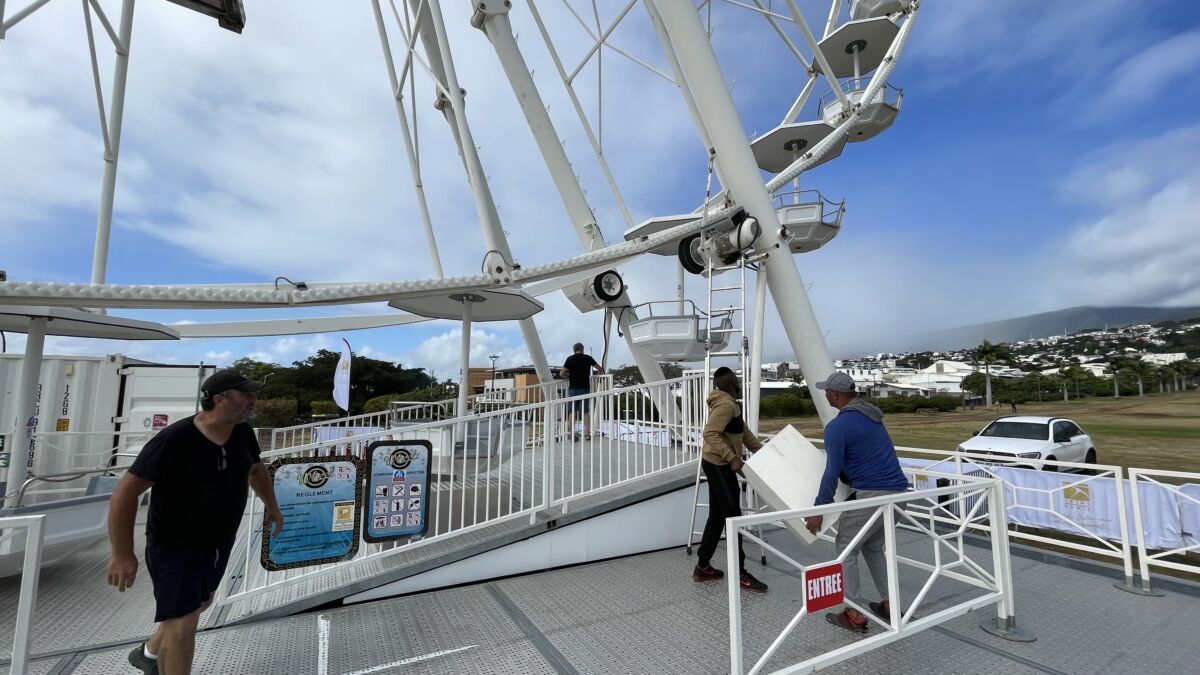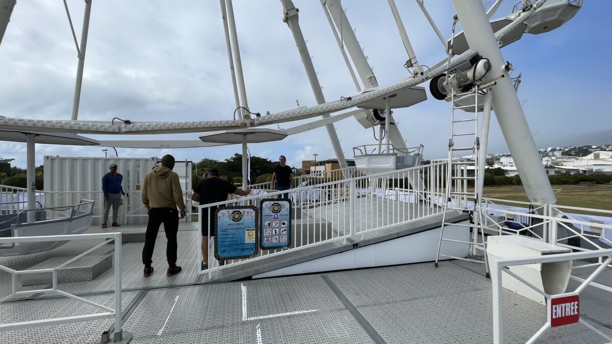 Installée depuis hier à Saint-Denis, la grande roue a subi ce matin un contrôle technique et de sécurité avec Franck qui le technicien attitré venu de Métropole et ses collègues. Ce contrôle est quotidien.