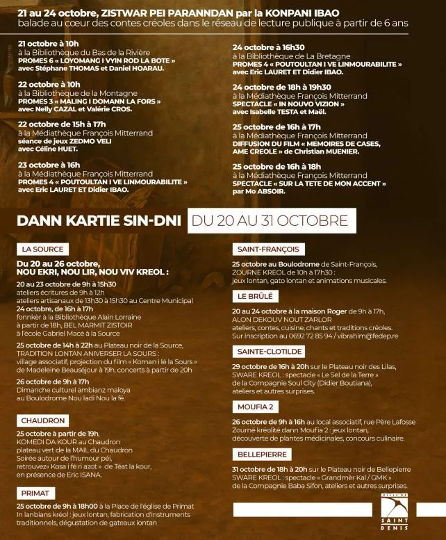 Sware Kréol – Compagnie Soul City29 octobre – 16h à 20hPlateau noir des Lilas, Sainte-ClotildeSpectacle “Grandmèr Kal / GMK” – Baba Sifon31 octobre – 18h à 20hPlateau noir de Bellepierre