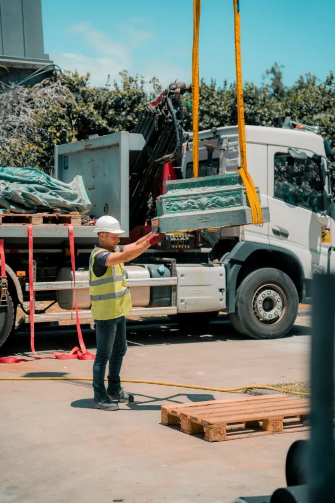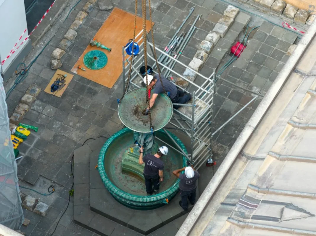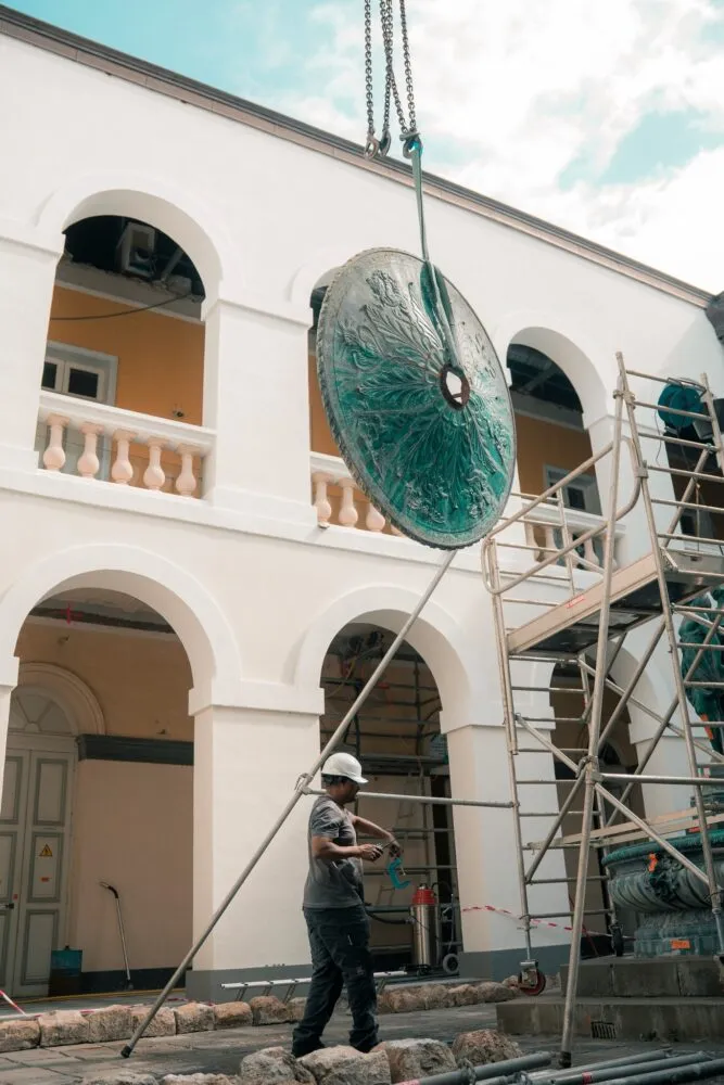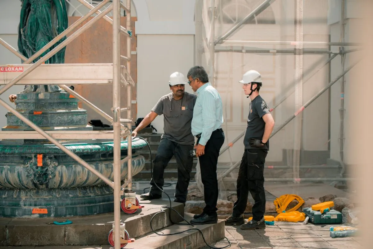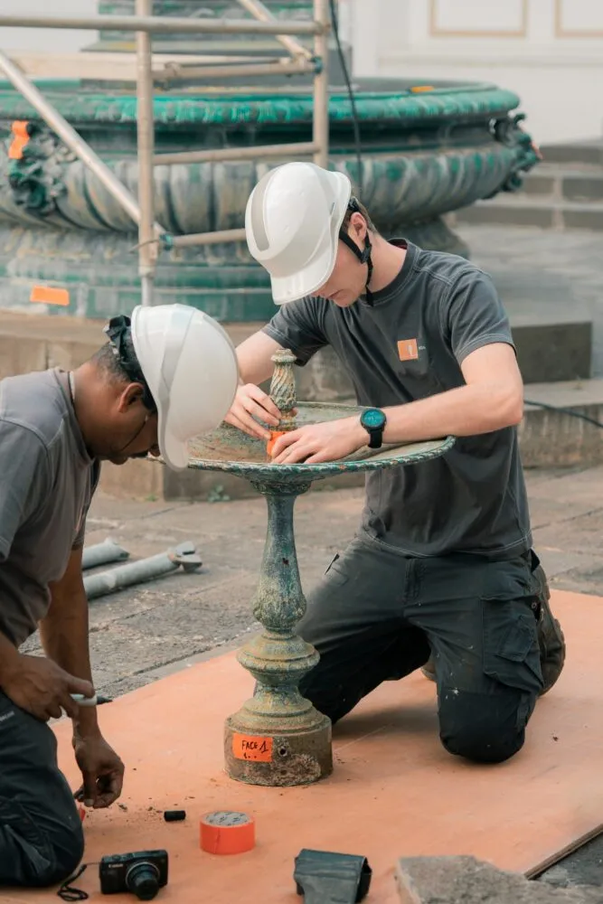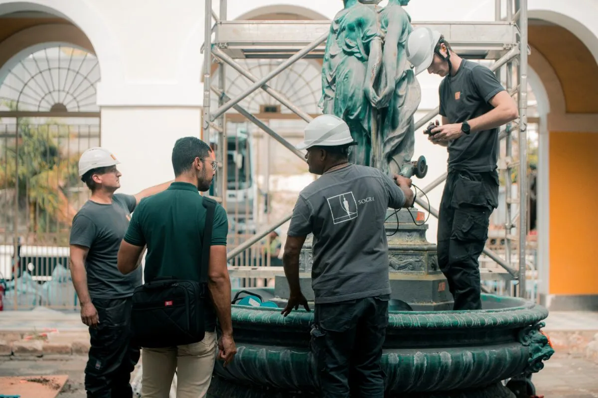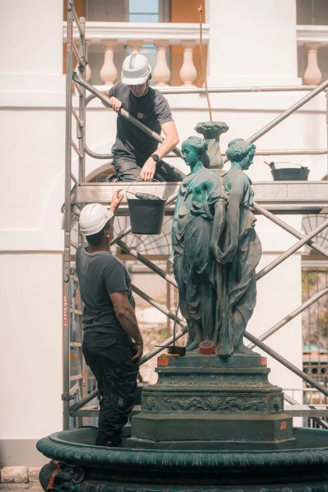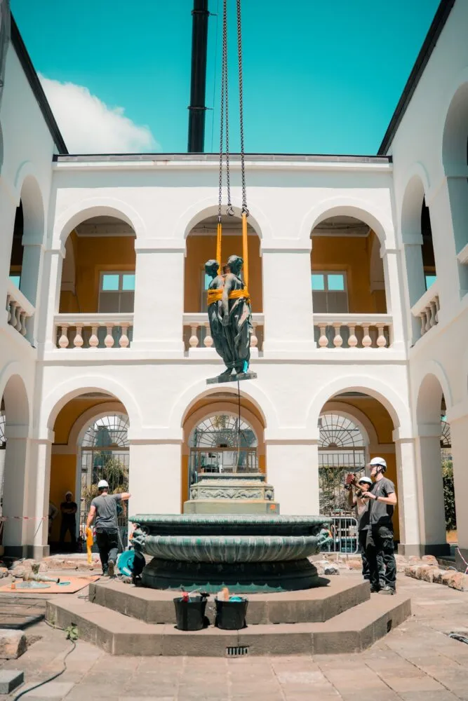 Une nouvelle étape majeure vient d’être franchie : le retrait de la fontaine emblématique. Celle-ci sera entièrement restaurée avant de retrouver, une fois les travaux achevés, tout son éclat d’antan au cœur du site rénové.