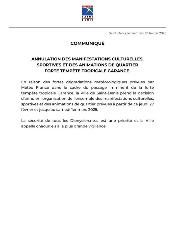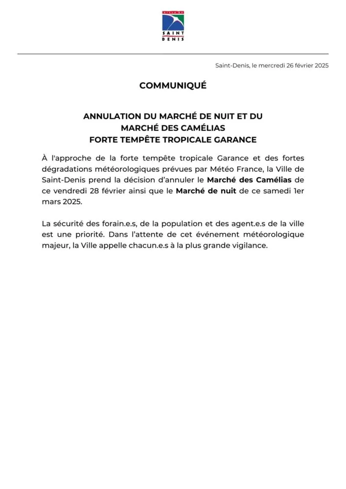 Actualités/Collectivités/Saint-Denis Saint-Denis : les manifestations et marchés dionysiens prévus ce wee-end annulés par La Rédaction 26 février 2025 1 min de lecture Dans des communiqués diffusés cet après-midi, la ville de Saint-Denis annonce l’annulation des manifestations et des marchés dionysiens prévus ce wee-end en raison du passage imminent de la forte tempête tropicale Garance. Ne manquez pas toute l’actualité de La Réunion ! Abonnez-vous à la newsletter de Free Dom ! Valider Partager Facebook Twitter Pinterest Linkedin Whatsapp Reddit Email Vous pourriez être intéressé par 31 décembre 2025 Mercredi 31 décembre 2025 – Météo, éphéméride et horoscope du jour 30 décembre 2025 Mardi 30 décembre 2025 – Météo, éphéméride et horoscope du jour 29 décembre 2025 Saint-Joseph : découverte de 2337 plants de cannabis, arrestation de 2 individus La Rédaction Laisser un commentaire Annuler la réponseYour email address will not be published. Enregistrer mon nom, mon e-mail et mon site dans le navigateur pour mon prochain commentaire. Current ye@r * Leave this field empty Article précédent Saint-Paul : 5 réservistes en action dès ce soir Article suivant Phénomène Garance : adaptation de l’activité du tribunal judiciaire de Saint-Denis Articles récents... Mercredi 31 décembre 2025 – Météo, éphéméride et horoscope du jour Hommage à Johnny Hallyday sur Free Dom 2 ce 5 décembre Mardi 30 décembre 2025 – Météo, éphéméride et horoscope du jour Saint-Joseph : découverte de 2337 plants de cannabis, arrestation de 2 individus Point sur le réseau routier départemental, 29 décembre à 16H30 Suicide sur le pont de la Rivière d’Abord : importante mobilisation des secours et des forces de l’ordre Radier submergé à Ilet Furcy : la route de Cilaos fermée à la circulation cette nuit Fortes pluies : appel à la plus grande prudence à Saint-Paul Saint-Gilles-les-Bains : une route impraticable, les riverains montent au créneau (VIDEOS) Très grands excès de vitesse : un délit passible de prison depuis le 29 décembre 2025