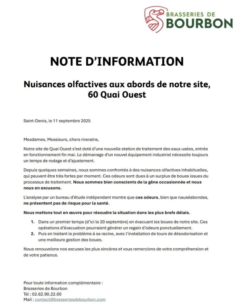 Depuis plusieurs semaines, des riverains du secteur du Quai Ouest, à Saint-Denis, se plaignent de nuisances olfactives particulièrement gênantes. Dans une note d’information diffusée ce jeudi 11 septembre 2025, les Brasseries de Bourbon confirment l’origine de ces odeurs et présentent leurs excuses.