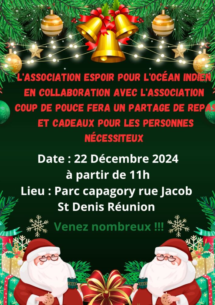 Le 22 décembre 2024, à partir de 11h, l’Association Espoir pour l’Océan Indien, en collaboration avec l’Association Coup de Pouce, organise un moment de partage et de générosité au Parc Capagory, rue Jacob, à Saint-Denis.