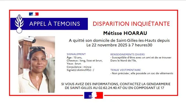 La gendarmerie de Saint-Gilles lance un appel à témoins après la disparition inquiétante de Métisse Hoarau, 13 ans. La jeune fille a quitté son domicile de Saint-Gilles-les-Hauts le 22 novembre 2025 vers 7 h 30 et n’a plus donné de nouvelles. De corpulence mince, elle a les cheveux longs, lisses et bruns, et les yeux bruns. Elle pourrait être avec un ami et se trouver dans le Nord de l’île. Toute information utile peut être transmise au 02 62 24 40 47 ou au 17.