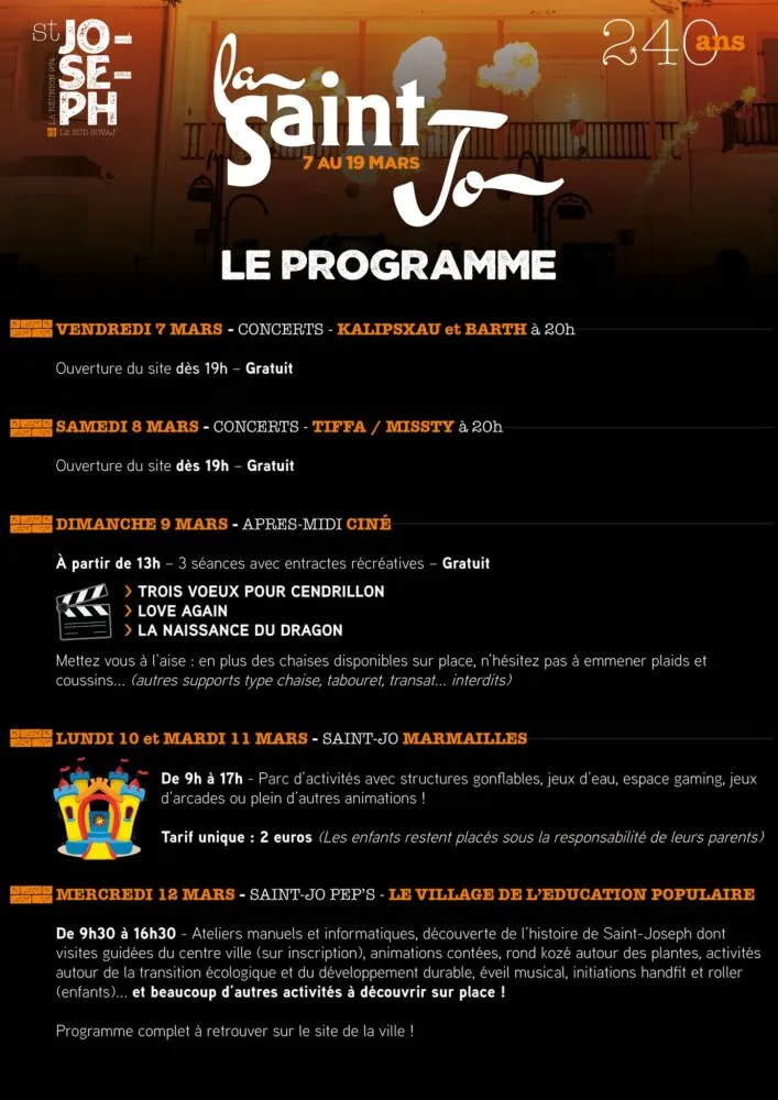 Actualités/Collectivités/Saint-Joseph Saint-Jo 2025 : la fête des 240 ans de la commune ! par Céline Hardelain 26 février 2025 1 min de lecture Du 7 au 19 mars, Saint-Joseph célèbre ses 240 ans avec une édition spéciale de la Saint-Jo ! Concerts, animations et temps forts sont au programme pour faire vibrer la ville. Découvrez le programme complet ici : Ne manquez pas toute l’actualité de La Réunion ! Abonnez-vous à la newsletter de Free Dom ! Valider Partager Facebook Twitter Pinterest Linkedin Whatsapp Reddit Email Vous pourriez être intéressé par 31 décembre 2025 Mercredi 31 décembre 2025 – Météo, éphéméride et horoscope du jour 30 décembre 2025 Mardi 30 décembre 2025 – Météo, éphéméride et horoscope du jour 29 décembre 2025 Saint-Joseph : découverte de 2337 plants de cannabis, arrestation de 2 individus Céline Hardelain Laisser un commentaire Annuler la réponseYour email address will not be published. Enregistrer mon nom, mon e-mail et mon site dans le navigateur pour mon prochain commentaire. Current ye@r * Leave this field empty Article précédent Les aboiements d’un chien au cœur d’une expulsion controversée à Sainte-Clotilde (Podcast) Article suivant Dépannage sur la route des Tamarins : merci à Mathieu de Mafate Hélicoptère (Podcast) Articles récents... Mercredi 31 décembre 2025 – Météo, éphéméride et horoscope du jour Hommage à Johnny Hallyday sur Free Dom 2 ce 5 décembre Mardi 30 décembre 2025 – Météo, éphéméride et horoscope du jour Saint-Joseph : découverte de 2337 plants de cannabis, arrestation de 2 individus Point sur le réseau routier départemental, 29 décembre à 16H30 Suicide sur le pont de la Rivière d’Abord : importante mobilisation des secours et des forces de l’ordre Radier submergé à Ilet Furcy : la route de Cilaos fermée à la circulation cette nuit Fortes pluies : appel à la plus grande prudence à Saint-Paul Saint-Gilles-les-Bains : une route impraticable, les riverains montent au créneau (VIDEOS) Très grands excès de vitesse : un délit passible de prison depuis le 29 décembre 2025