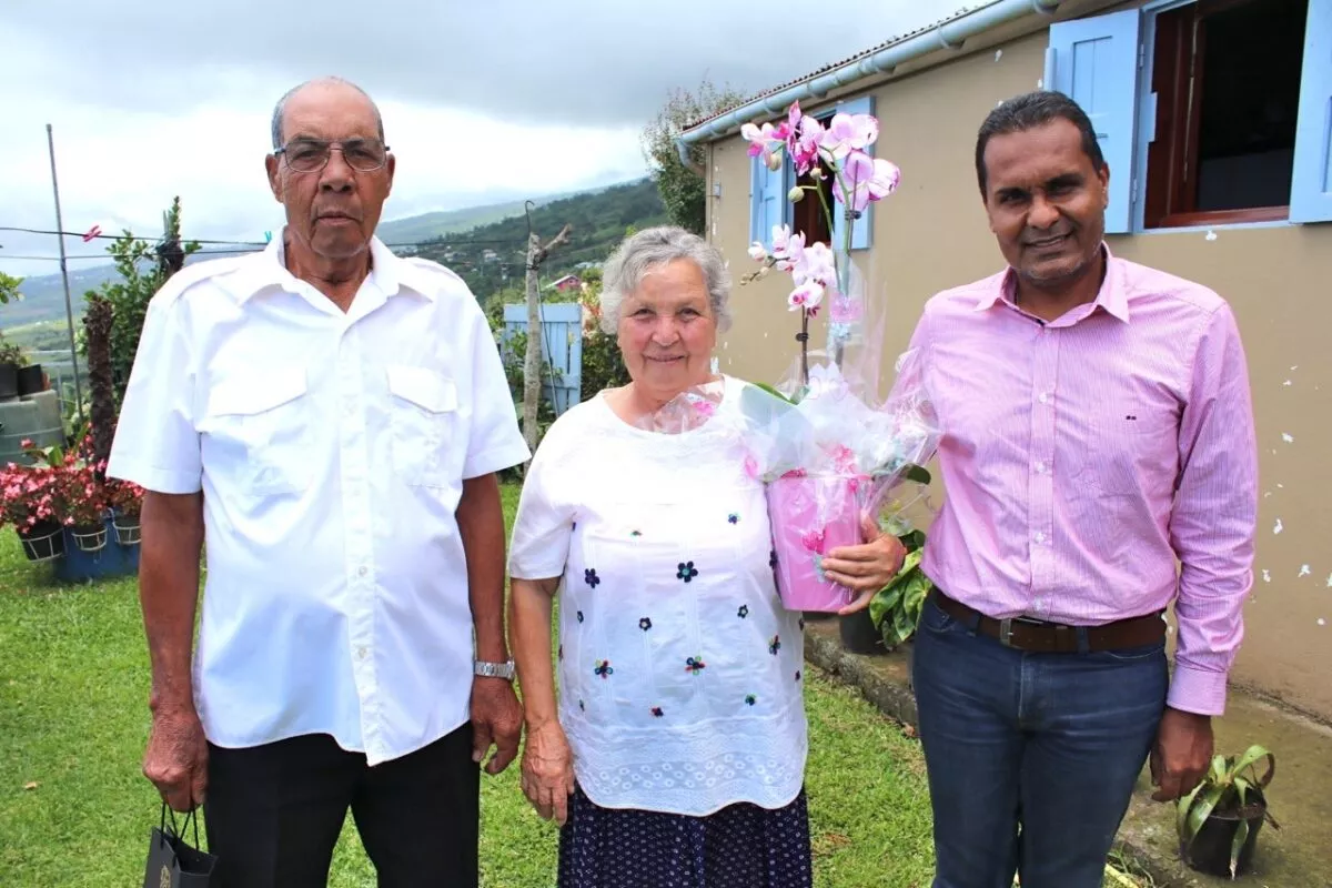 Entourés de leur famille et en présence du Maire Bruno Domen, des élues Madame Marie Alexandre et Madame Gisèle Belin, ils ont fêté aujourd’hui leurs 55 ans de mariage. C’est lors d’une promenade que Nicaise et Emmaüs se sont rencontrés. D’abord intimidés, ils se sont peu à peu rapprochés pour ne jamais plus se quitter et vivre une vie heureuse dans la fraicheur des Hauts, dans leur quartier du Plate à Saint-Leu.