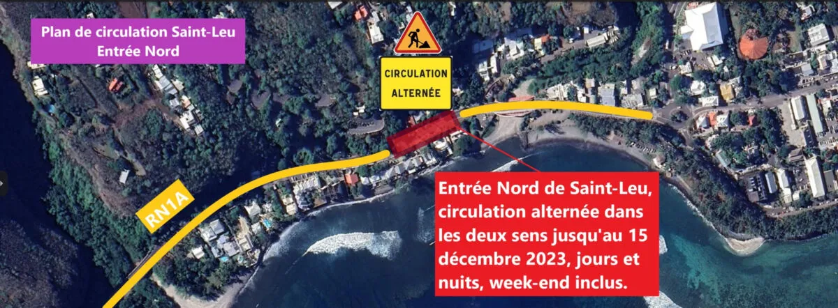 Enfin, l’atelier situé à l’entrée Nord de Saint-Leu, au niveau du Sarah Beach, est actif. Un alternat de circulation est en place dans les deux sens, jours et nuits, y compris le week-end. Ces travaux entraîneront une modification de la circulation jusqu’au 15 décembre. Nous recommandons aux usagers de privilégier la sortie Stella pour rejoindre le centre-ville.