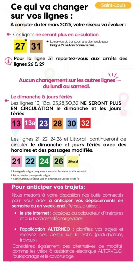 À compter du 1er mars 2025, plusieurs changements sont à prévoir sur le réseau de transport Alternéo à Saint-Louis. Certaines lignes ne circuleront plus, tandis que d’autres connaîtront des ajustements, notamment les dimanches et jours fériés.
