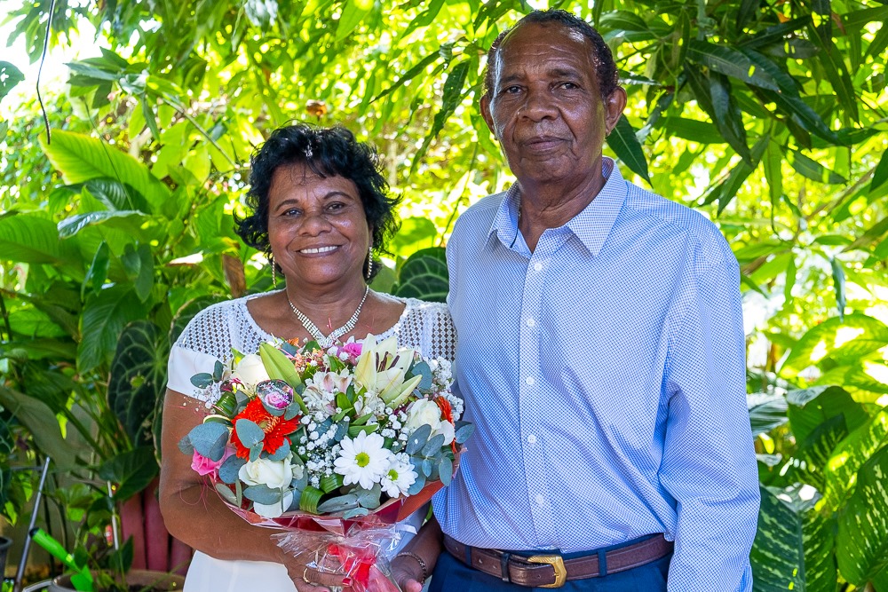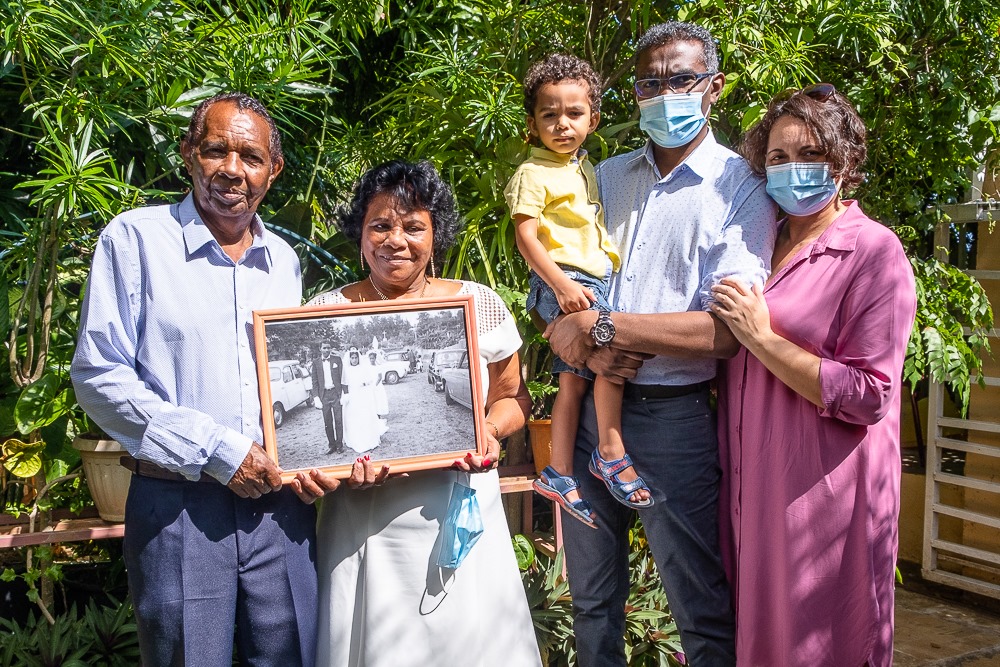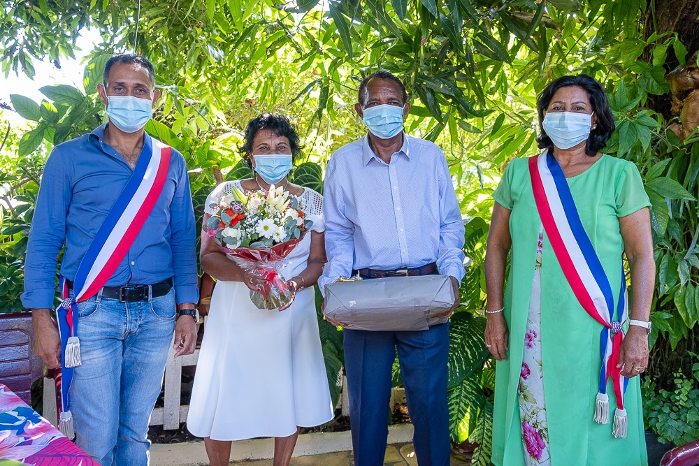 Mariés le 18 avril 1971, Henry Alexin et Ruffine SAÏDOU, respectivement 72 et 67 ans, ont reçu la visite de Marie-Bernadette MOUNIAMA CUVELIER et Jean-Noël JEAN-BAPTISTE, venus leur remettre un présent au nom de la ville de Saint-Paul.