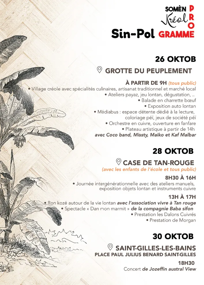 La Ville de Saint-Paul vous invite à vivre une nouvelle édition de la Somen Kréol, du 25 au 30 octobre 2025, une semaine exceptionnelle dédiée à la richesse de notre culture, à la beauté de notre langue, à nos traditions et à notre patrimoine vivant.