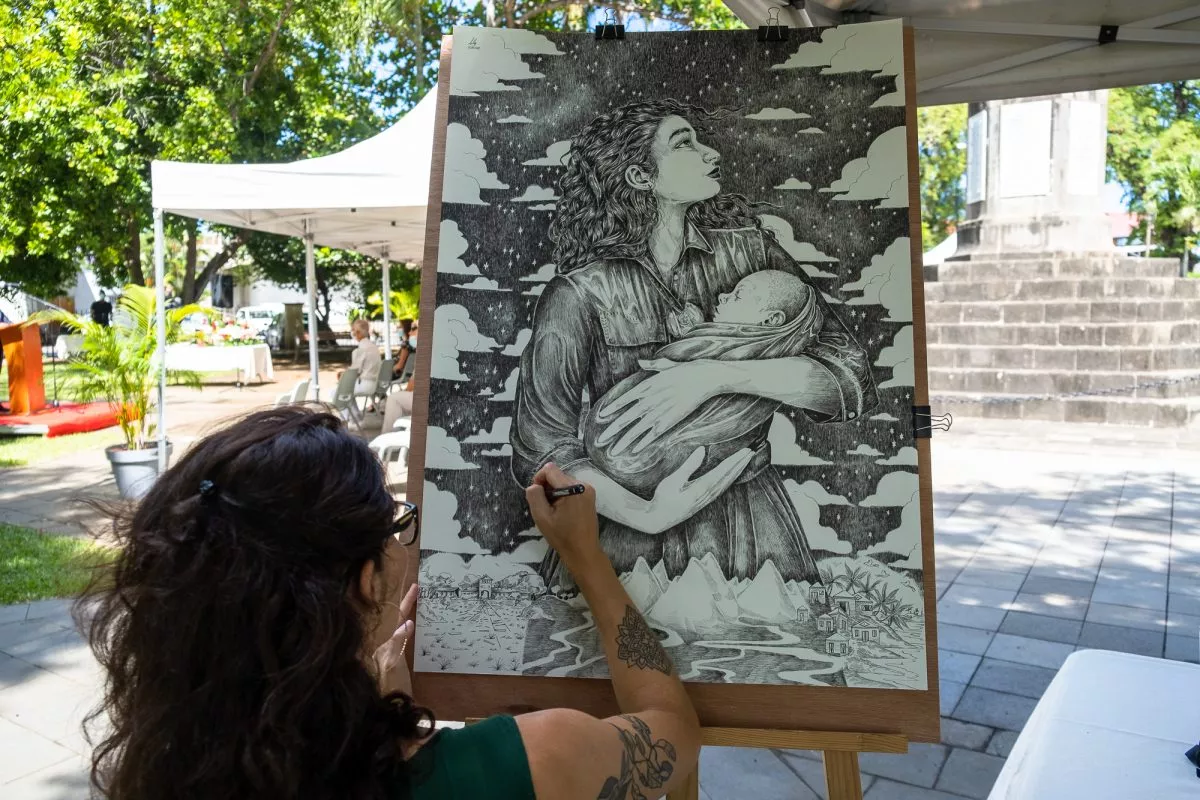 Cette illustratrice, auteure et scénariste, réalise un tableau représentant une mère portant son enfant dans les bras. Cette œuvre symbolise notamment les nouvelles générations qui évoluent dans nos société teintées de modernité.