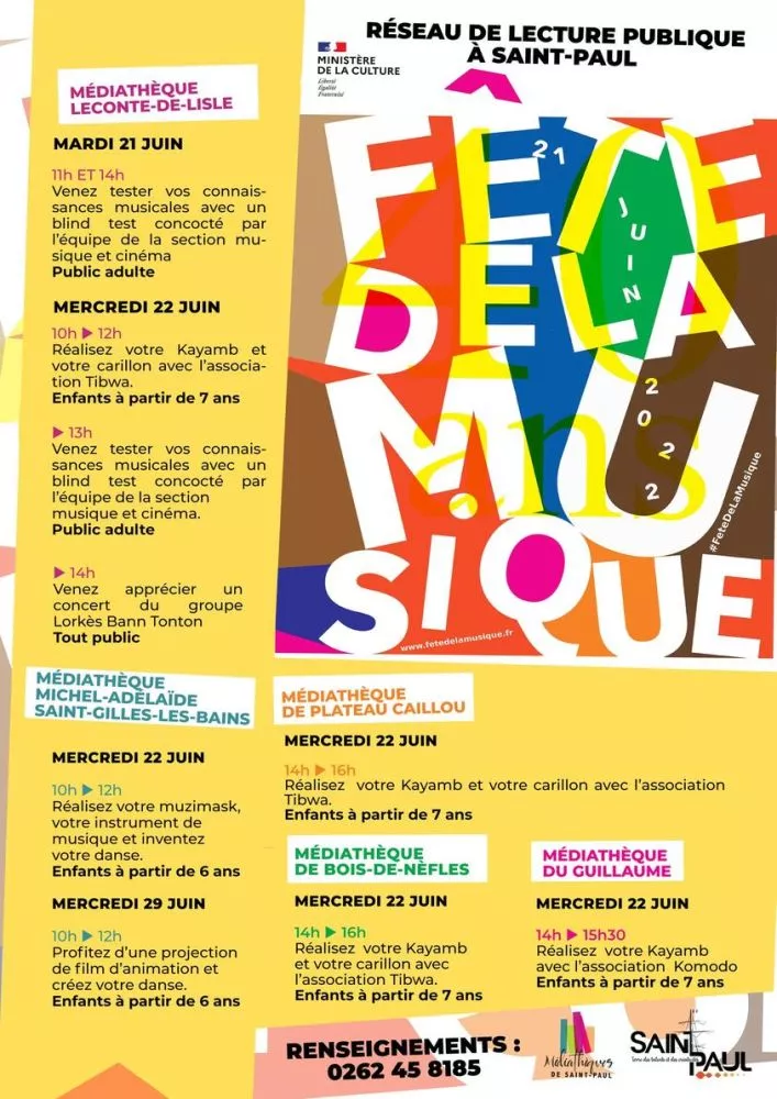 Dans le cadre de la Fête de la Musique, des animations vous seront proposées dès mardi 21 juin dans les différents réseaux de lecture publique à Saint-Paul. Réalisation de Kayamb, projection de film, création de danse, blind test…
