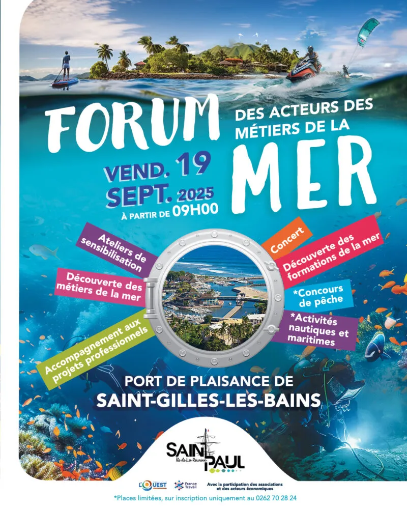Le vendredi 19 septembre 2025, dès 9h00, le port de plaisance de Saint-Gilles-les-Bains accueillera le forum des acteurs des métiers de la mer, une journée dédiée à la découverte des nombreuses opportunités professionnelles et de formation dans ce secteur vital pour La Réunion.