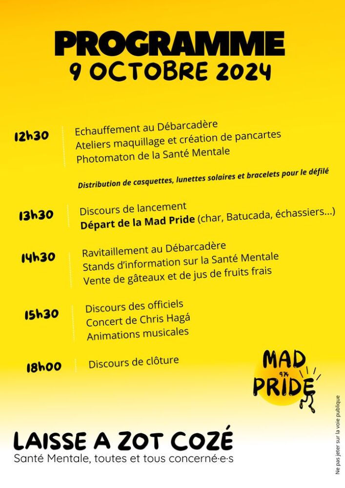 Le 9 octobre dernier, la ville de Saint-Paul a accueilli un événement exceptionnel : la Mad Pride, organisée dans le cadre des Semaines d’Information sur la Santé Mentale (SISM). Cette marche festive, empreinte de solidarité et de sensibilisation, a rassemblé des centaines de personnes autour d’un message clair : la santé mentale est l’affaire de tous.
