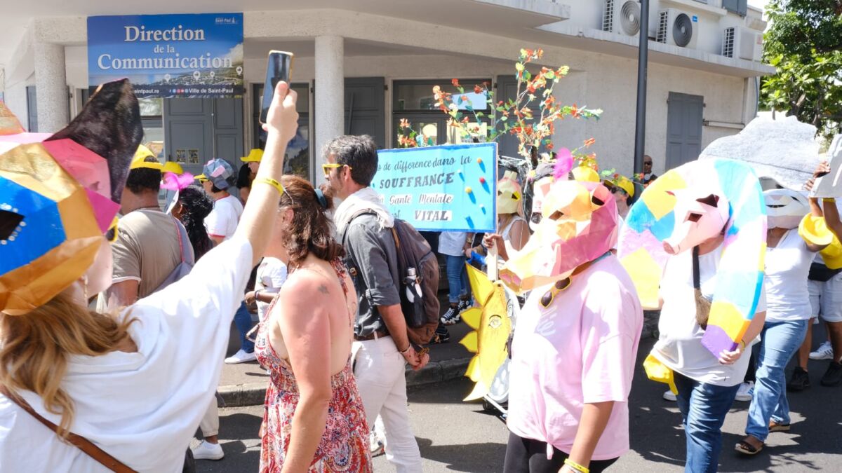 Dès 12h30, le parvis du Débarcadère s’est animé avec des ateliers préparatifs, mêlant échauffements collectifs, maquillage coloré, et confection de pancartes affichant des slogans engagés pour la déstigmatisation des troubles psychiques. À 13h30, la marche a pris son départ dans une ambiance joyeuse, parcourant les rues de Saint-Paul sur un trajet d’environ 1 km, sous les applaudissements des passants.