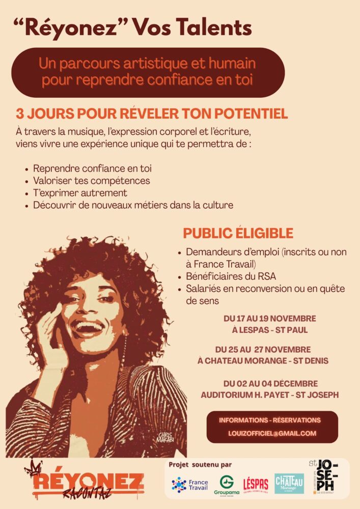 D’autres sessions sont d’ores et déjà programmées à Saint-Paul, Saint-Denis et Saint-Joseph.Ce projet s’adresse à des demandeurs d’emploi, bénéficiaires du RSA ou salariés en parcours d’insertion qui souhaitent reprendre confiance, libérer la parole et retrouver une énergie positive à travers un travail d’expression artistique (écriture, musique, mouvement, échanges collectifs…).