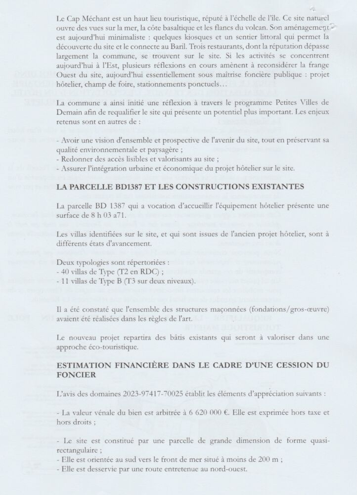 Dans sa réponse aux observations de la CRC datée du 5 novembre 2020, Olivier Rivière, maire de Saint-Philippe, écrit : « Le projet hôtelier prévu sur le site du Cap Méchant n’est pas remis en cause » (…). Actuellement la collectivité a repris possession du terrain et des constructions édifiées (résiliation du bail) et un nouveau planning de réalisation du projet est en cours de finalisation selon les prévisions suivantes :