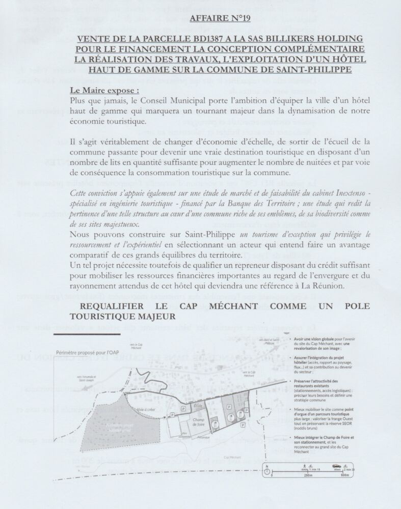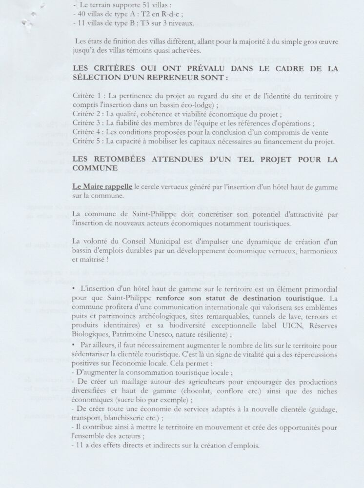Rappelons que dans son rapport en date du 24 septembre 2020, concernant la commune de Saint-Philippe (exercices 2015 et suivants) la Chambre Régionale des Comptes (CRC) observait (page 9, paragraphe 1.1.3) « le soutien financièrement risqué au développement économique ».  Elle mettait l’accent notamment sur « l’échec des deux baux à construction conclus avant 2015 » dont celui concernant la SCI Le Superbe. Celui-ci a été conclu le 18 mars 2014 « pour la construction d’un complexe hôtelier de luxe composé de 82 villas sur 13 ha situés au Cap méchant ». Les travaux ont été arrêtés en 2016. La municipalité décide par délibération du conseil municipal datée du 27 juillet 2020 de résilier le bail, « sur fond d’escroquerie et de malversations financières », dit France infos dans un reportage en date du 4 novembre 2022.