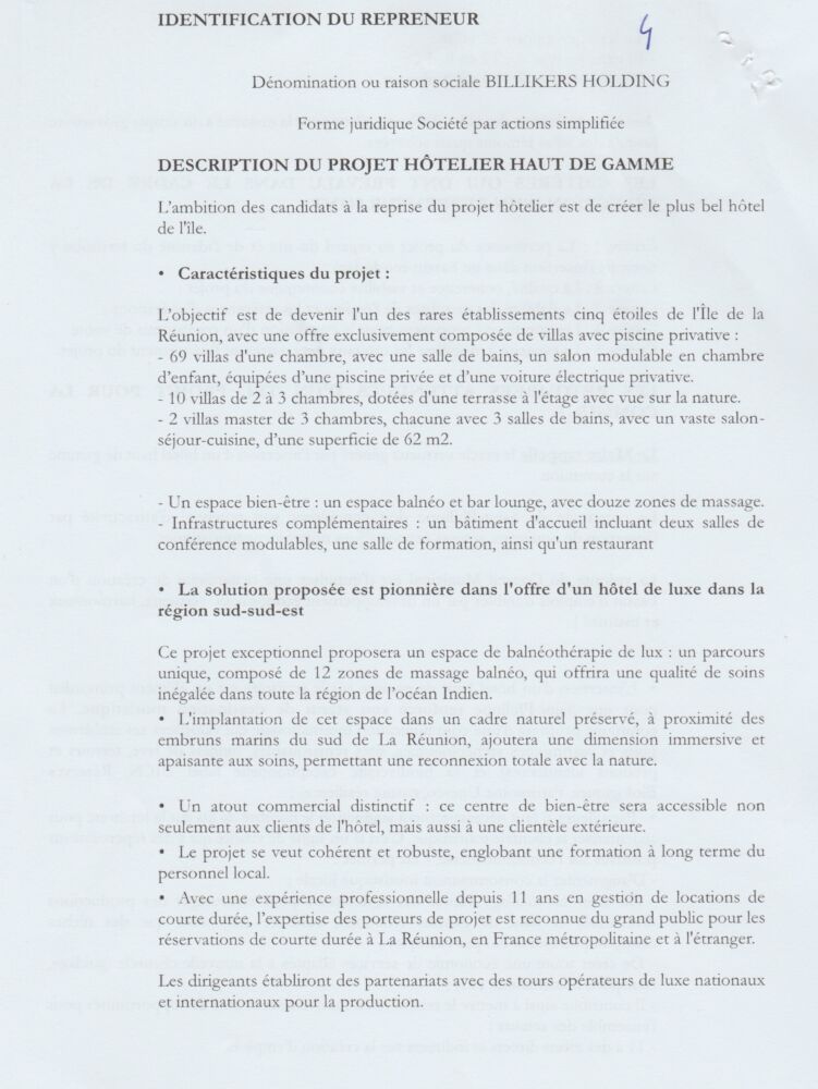 C’est le projet « Le Superbe », un hôtel 5 étoiles que le maire de Saint-Philippe, Olivier Rivière voulait concrétiser avec des promoteurs chinois dont un certain Patrick Jiang. Un projet d’une trentaine de millions d’euros lancé en 2012, avec première pierre posée vers 2014 pour 82 villas qui devaient ouvrir leurs portes en 2016/2017. 82 luxueuses villas avec piscines, restaurants, boutiques, discothèque, bar. Mais l’affaire a foiré. Les villas en question n’ont jamais vu le jour.