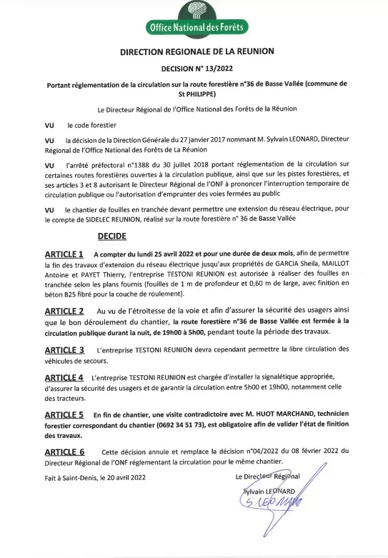 Actualités Saint-Philippe : Route forestière n°36 est fermée à la circulation publique de 19h00 à 5h00 par La Rédaction 20 avril 2022 1 min de lecture A compter du 25 avril 2022 et pour une durée de deux mois, la route forestière n°36 est fermée à la circulation publique durant le nuit, de 19h00 à 5h00 afin de permettre la fin des travaux d’extension du réseau électrique. Ne manquez pas toute l’actualité de La Réunion ! Abonnez-vous à la newsletter de Free Dom ! Valider Partager Facebook Twitter Pinterest Linkedin Whatsapp Reddit Email Catégorie: fermetureroutetravaux Vous pourriez être intéressé par 31 décembre 2025 Mercredi 31 décembre 2025 – Météo, éphéméride et horoscope du jour 30 décembre 2025 Mardi 30 décembre 2025 – Météo, éphéméride et horoscope du jour 29 décembre 2025 Saint-Joseph : découverte de 2337 plants de cannabis, arrestation de 2 individus La Rédaction Laisser un commentaire Annuler la réponseYour email address will not be published. Enregistrer mon nom, mon e-mail et mon site dans le navigateur pour mon prochain commentaire. Current ye@r * Leave this field empty Article précédent Réouverture du sentier de Grand Bassin (commune du Tampon) Article suivant La Ligue des Droits de l’Homme à la Réunion dit non à l’extrême droite ! Articles récents... Mercredi 31 décembre 2025 – Météo, éphéméride et horoscope du jour Hommage à Johnny Hallyday sur Free Dom 2 ce 5 décembre Mardi 30 décembre 2025 – Météo, éphéméride et horoscope du jour Saint-Joseph : découverte de 2337 plants de cannabis, arrestation de 2 individus Point sur le réseau routier départemental, 29 décembre à 16H30 Suicide sur le pont de la Rivière d’Abord : importante mobilisation des secours et des forces de l’ordre Radier submergé à Ilet Furcy : la route de Cilaos fermée à la circulation cette nuit Fortes pluies : appel à la plus grande prudence à Saint-Paul Saint-Gilles-les-Bains : une route impraticable, les riverains montent au créneau (VIDEOS) Très grands excès de vitesse : un délit passible de prison depuis le 29 décembre 2025