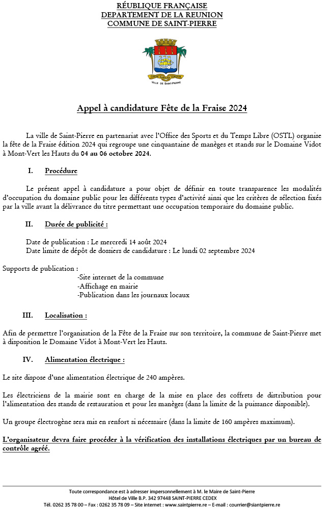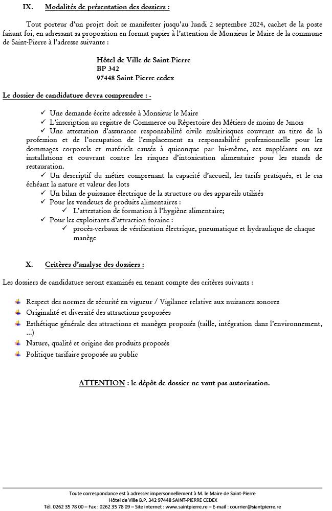 Les candidats intéressés doivent soumettre leur dossier avant le jeudi 2 septembre 2024. Le dossier de candidature doit inclure une demande écrite adressée au Maire de Saint-Pierre, une inscription au registre de commerce ou au répertoire des métiers, une attestation d’assurance, ainsi qu’un descriptif détaillé des activités proposées. Pour les manèges et les stands alimentaires, des vérifications techniques supplémentaires sont exigées.