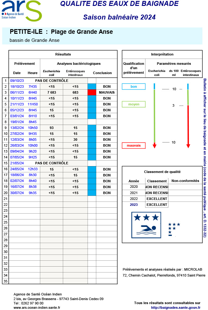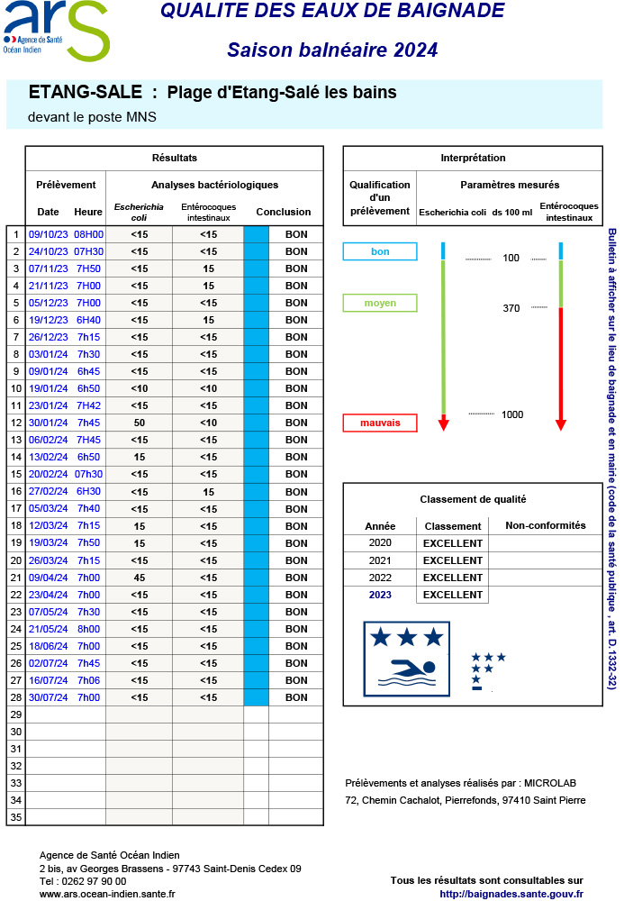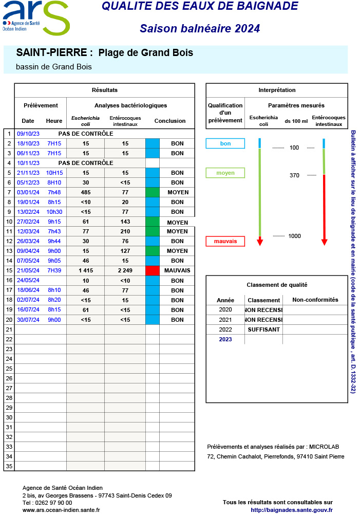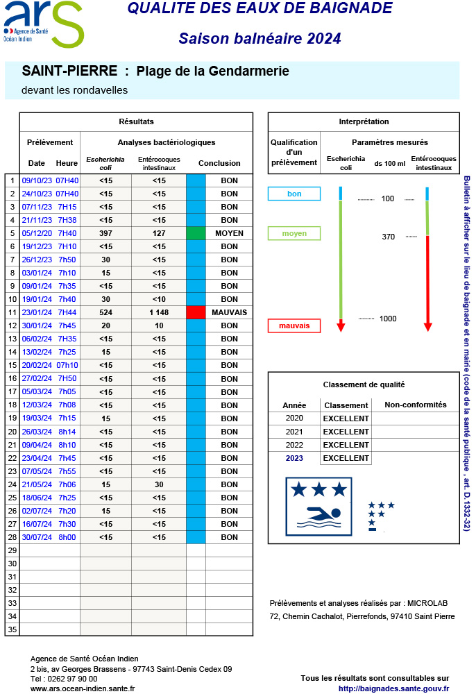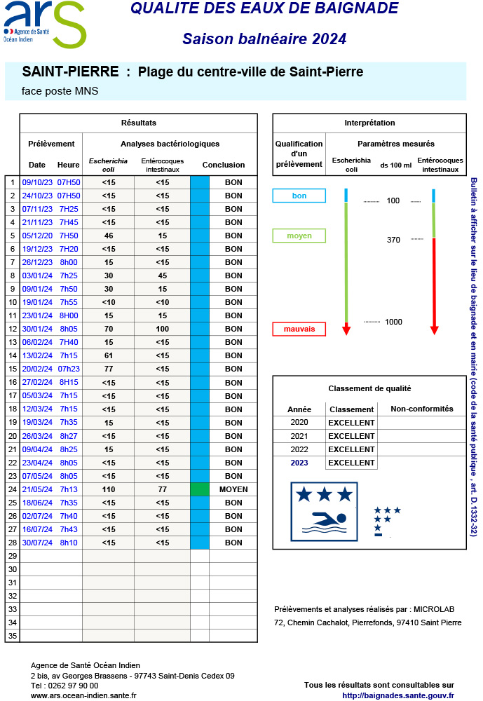 En cette période de vacances estivales, la ville de Saint-Pierre souhaite informer ses résidents et visiteurs de la qualité des eaux de baignade le long de son front de mer, particulièrement fréquenté en ce moment.