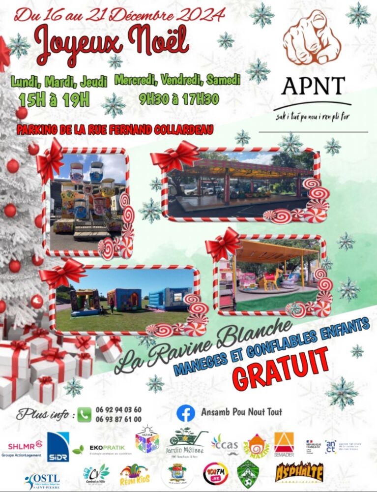 La magie de Noël s’installe à Saint-Pierre, et c’est à la Ravine Blanche que tout commence ! L’association Ansamb Pou Nou Tout (APNT) vous donne rendez-vous pour une semaine d’animations et de partage, du lundi 16 au samedi 21 décembre 2024 . Un programme riche en activités gratuites attend les petits et grands, avec l’objectif de rassembler dans la joie et la bonne humeur.