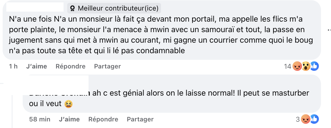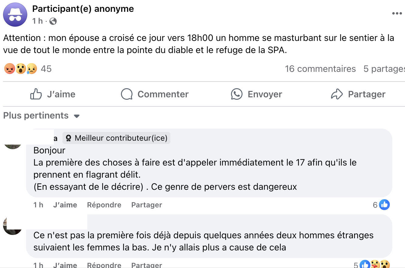 Sur le groupe Facebook « vivre à Saint-Pierre de La Réunion », un membre poste une alerte : « mon épouse a croisé ce jour vers 18h00 un homme se masturbant sur le sentier à la vue de tout le monde entre la pointe du diable et le refuge de la SPA. »