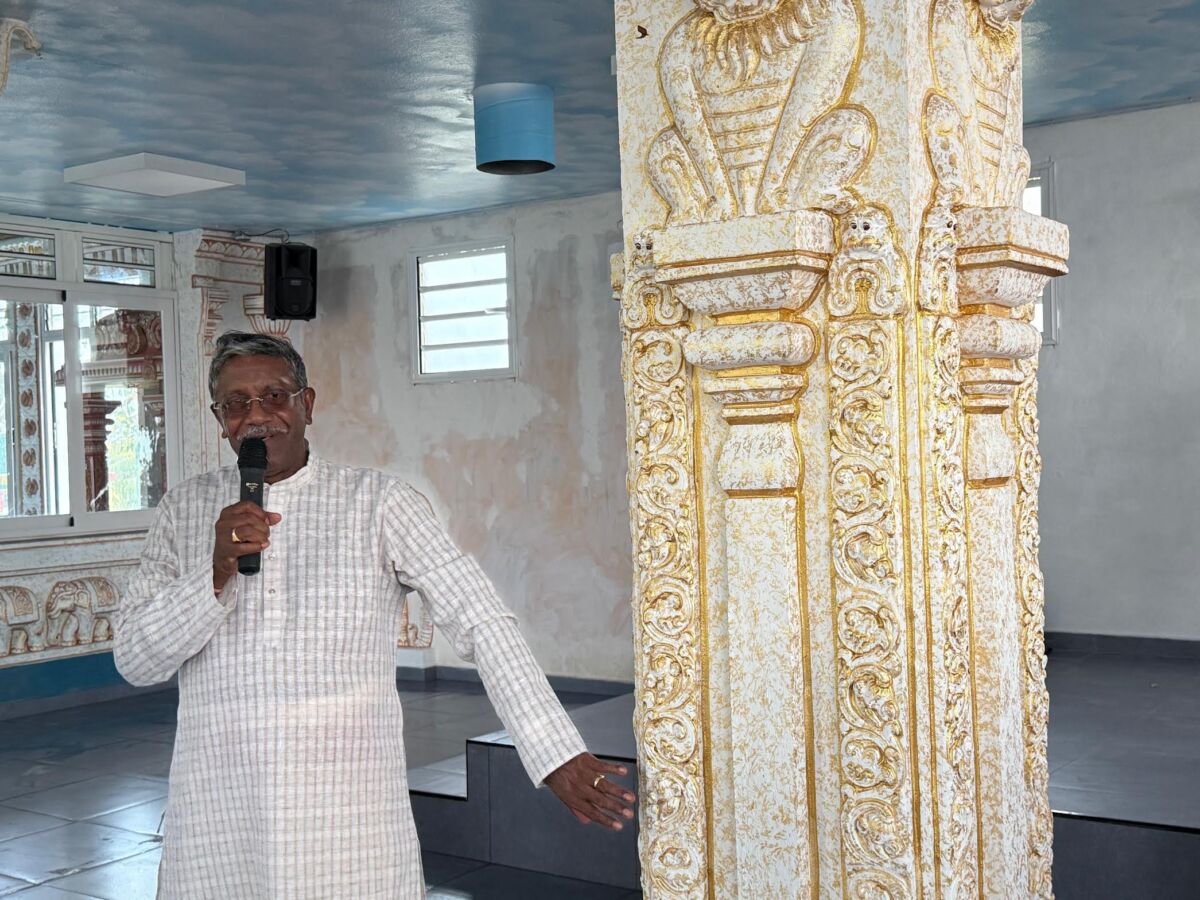 Les travaux sont en cours de finition. Aux côtés des membres de l’association Kalrou Marliémen, se trouve un prêtre tamoul réunionnais dont la notoriété n’est plus à faire dans notre île. Il s’agit de Serge Coujendével Ajaguin-Soleyen, petit-fils de Tonton Permalnaïken barldon poussari. Cela fait 36 ans qu’il officie au temple de la Ravine-Glissante lors des marches sur le feu. Ecoutez Serge Ajaguin-Soleyen :