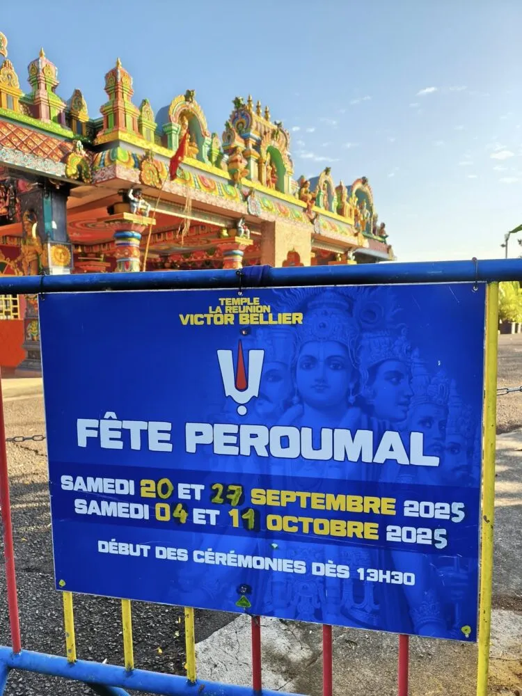 Le temple Victor Bellier invite l’ensemble des fidèles et des Réunionnais à prendre part aux célébrations de la Fête Péroumal, moment fort du calendrier religieux tamoul. Les cérémonies auront lieu les samedis 20 et 27 septembre, ainsi que les 4 et 11 octobre 2025.